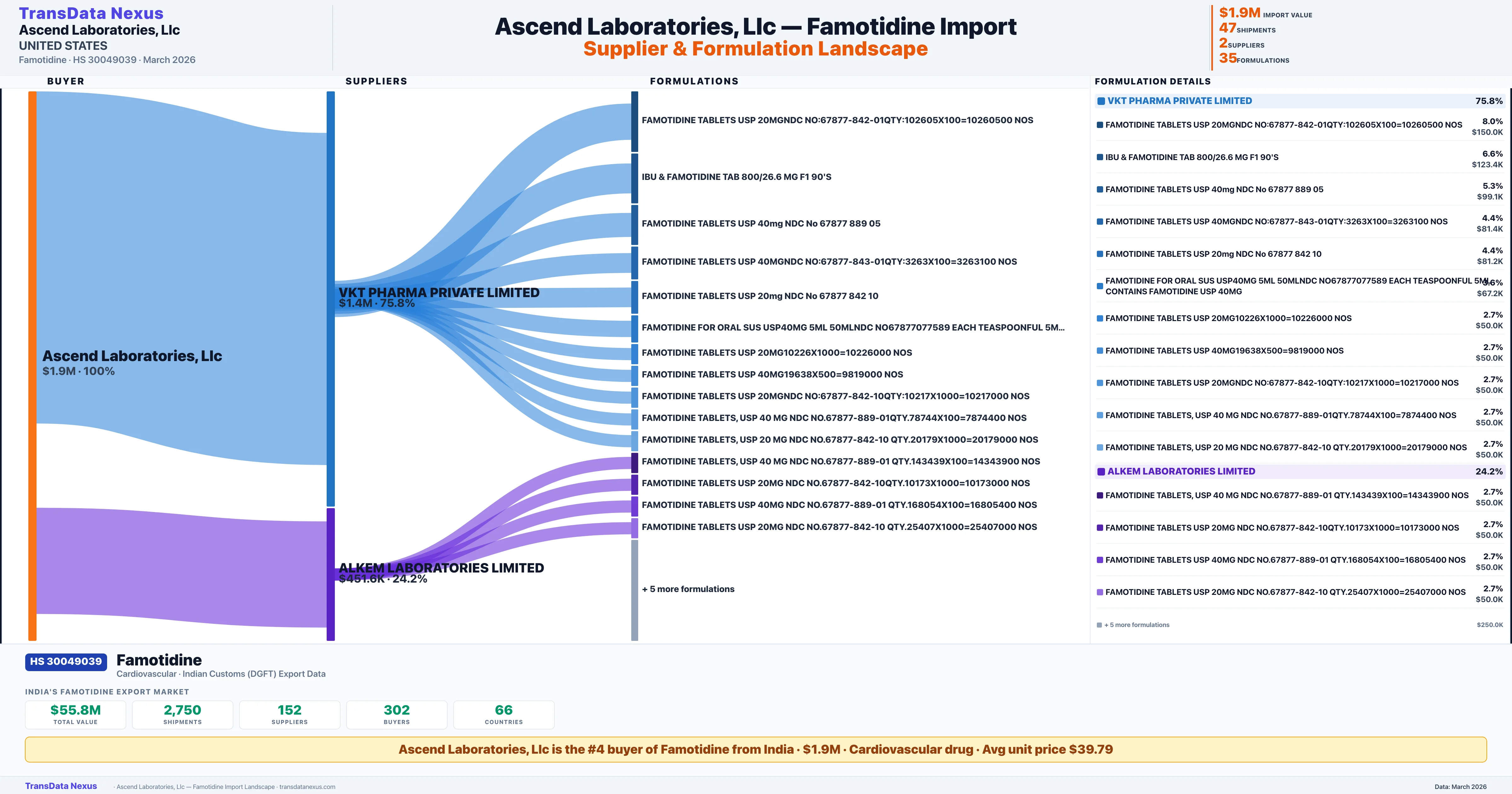 ASCEND LABORATORIES LLC sources Famotidine from 2 verified Indian suppliers: VKT PHARMA PRIVATE LIMITED ($1.4M, 75.8%), ALKEM LABORATORIES LIMITED ($451.6K, 24.2%). This is based on 47 customs records.