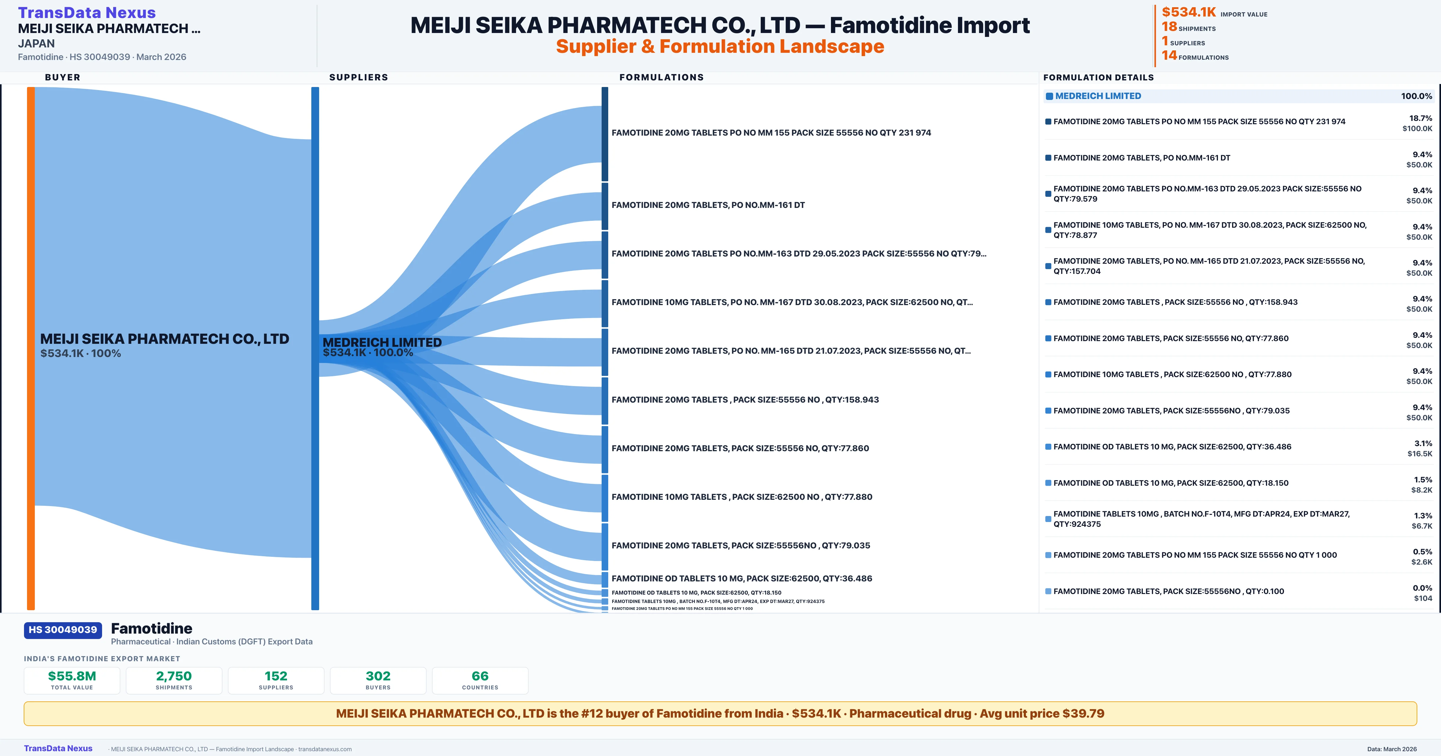 MEIJI SEIKA PHARMATECH CO., LTD sources Famotidine from 1 verified Indian supplier: MEDREICH LIMITED ($534.1K, 100.0%). This is based on 18 customs records.