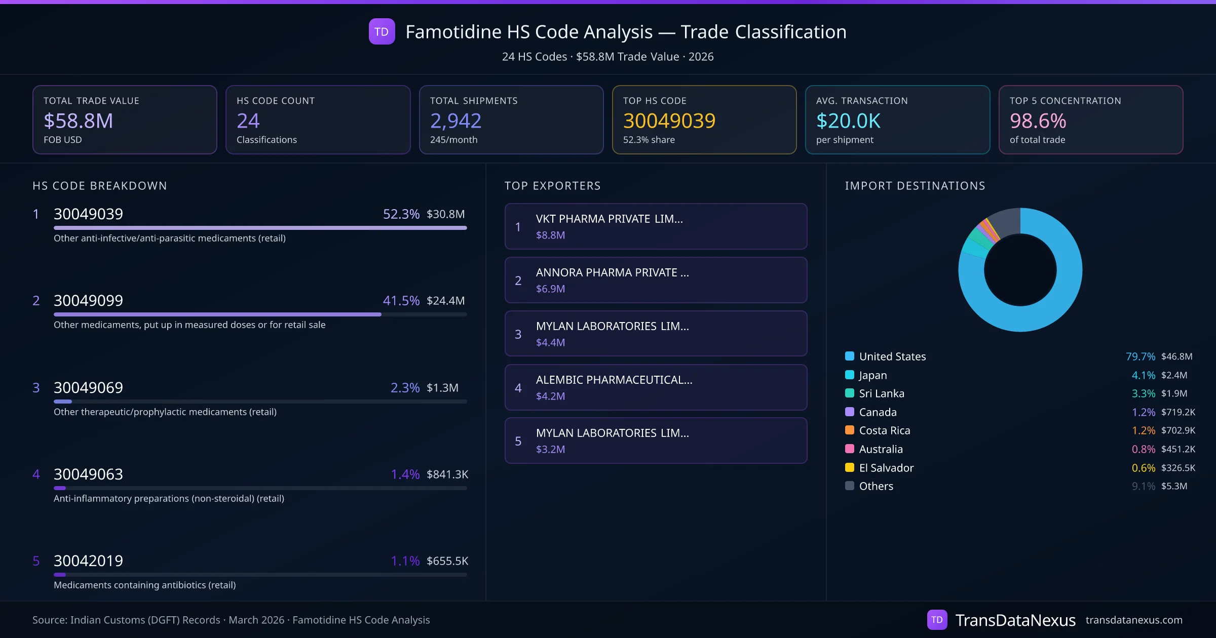 India exports Famotidine under 24 distinct HS code classifications, representing a total trade value of $58.8M across 2,942 shipments. The dominant classification is HS 30049039 (Other anti-infective/anti-parasitic medicaments (retail)), accounting for 52.3% of all Famotidine trade at $30.8M. HS 30049099 (Other medicaments, put up in measured doses or for retail sale) follows at 41.5% ($24.4M). The top 5 HS codes together account for 98.6% of total Famotidine trade from India. The average transaction value is $19974. Key importing markets include United States, Japan, Sri Lanka. Leading exporters include VKT PHARMA PRIVATE LIMITED and ANNORA PHARMA PRIVATE LIMITED. Data sourced from Indian Customs (DGFT) shipping bill records.