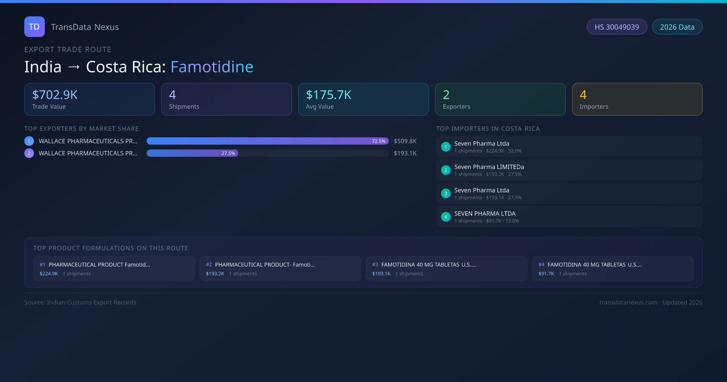The India to Costa Rica Famotidine corridor is one of India's established pharmaceutical export routes, with 4 shipments documented worth a combined $702.9K USD. The route is dominated by WALLACE PHARMACEUTICALS PRIVATE LIMITED, which alone accounts for roughly 73% of all export value, reflecting the consolidated nature of India's famotidine manufacturing sector.
