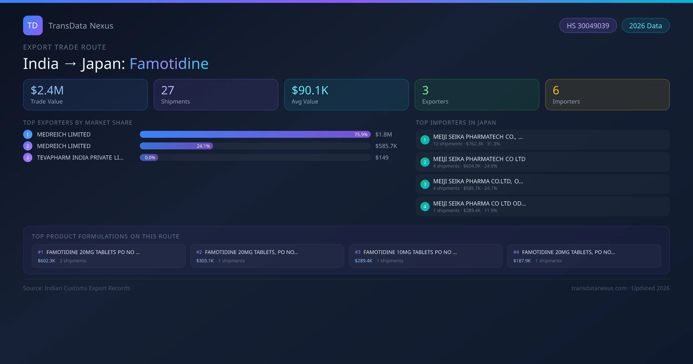 India exports Famotidine to Japan worth approximately $2.4M USD across 27 recorded shipments. The average value per shipment is $90.1K USD.