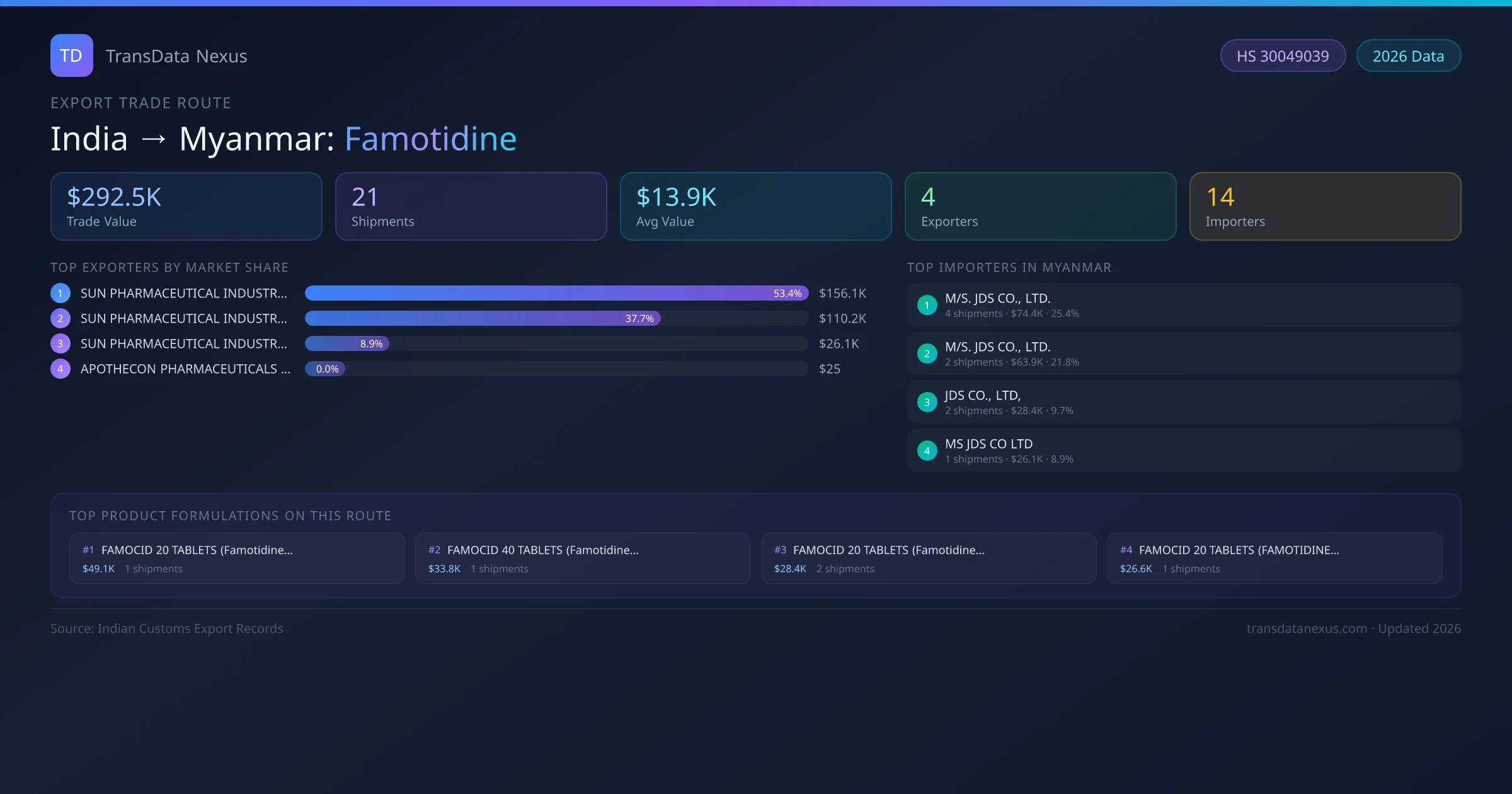- 1.Route Identification: India to Myanmar export trade corridor identified from Indian Customs (DGFT) records for Famotidine.