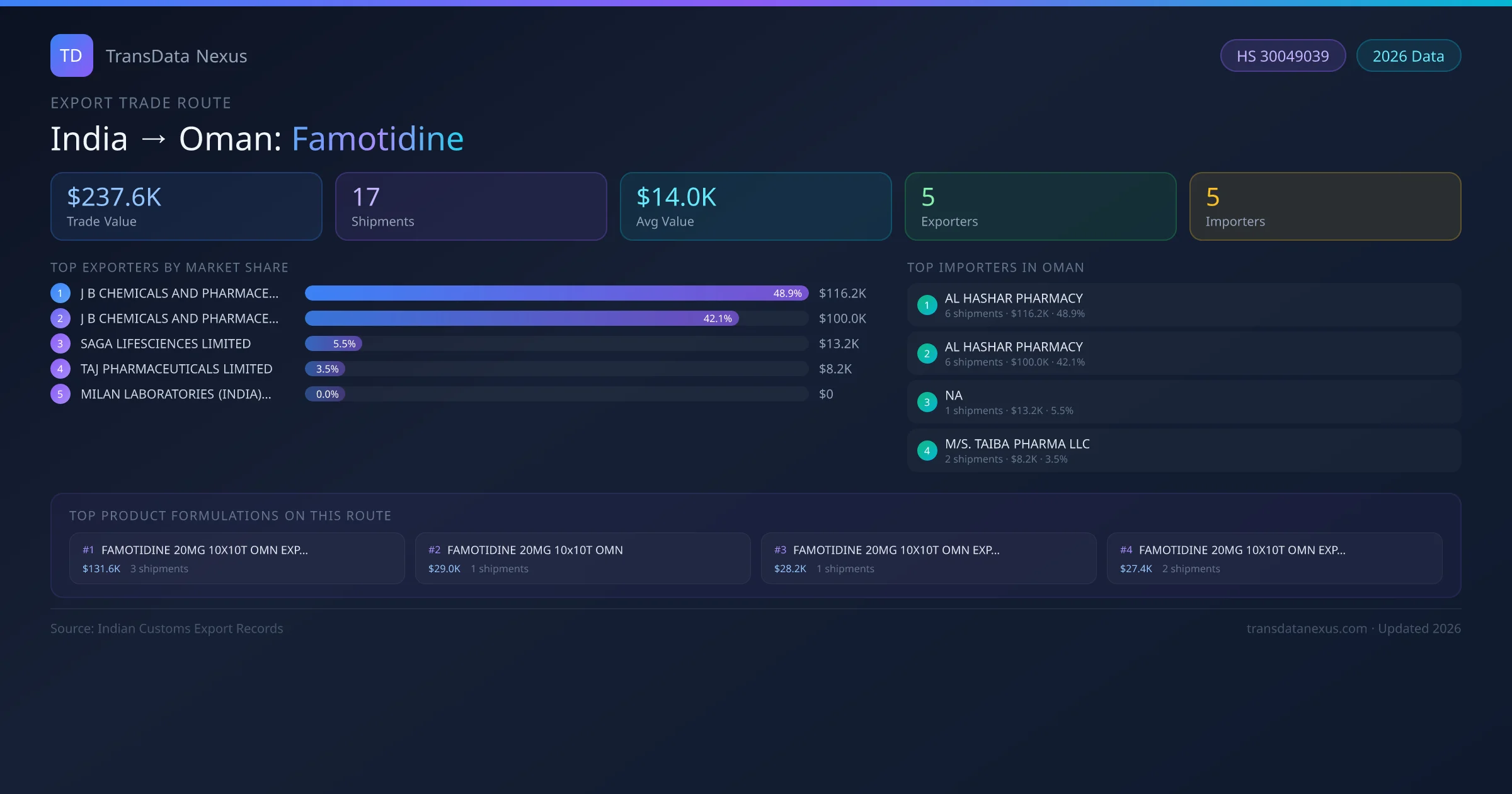 - 1.Route Identification: India to Oman export trade corridor identified from Indian Customs (DGFT) records for Famotidine.