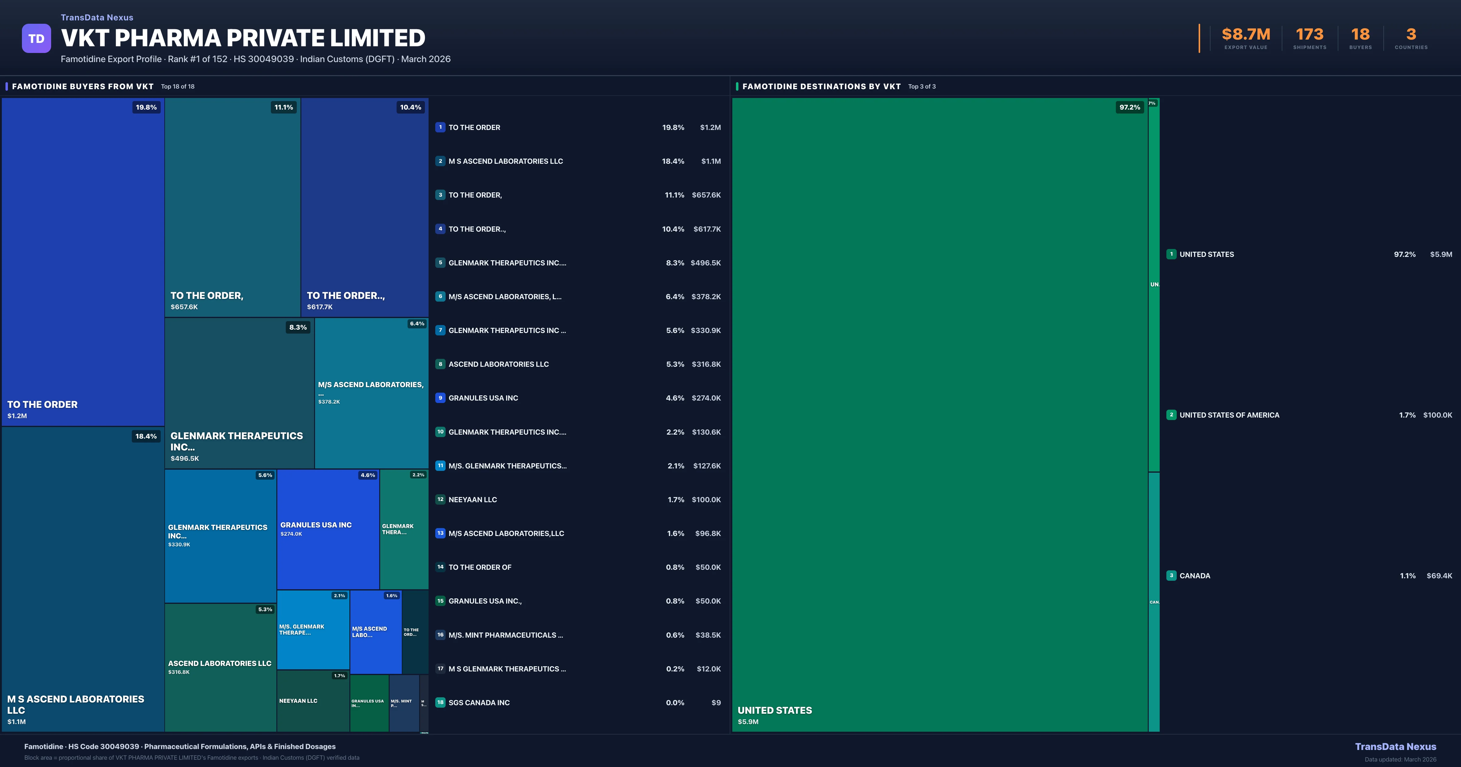VKT Pharma Private Limited supplies Famotidine to 18 buyers globally. The largest buyer is TO THE ORDER (UNITED STATES), followed by M S ASCEND LABORATORIES LLC (UNITED STATES) and TO THE ORDER, (UNITED STATES). These buyers represent pharmaceutical distributors, hospital groups, and government procurement agencies in their respective markets.