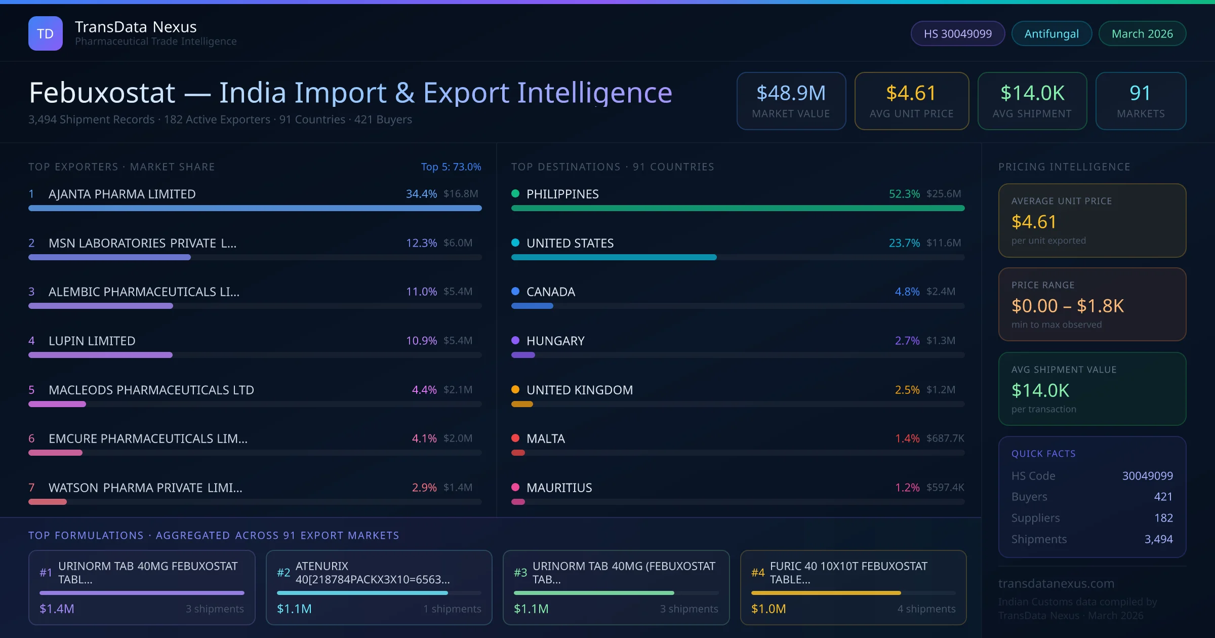 Between 2022 and 2026, India exported $48.9M worth of febuxostat across 3,494 verified shipments to 91 countries — covering 47% of world markets in the Lipid & Metabolism segment. The largest destination is PHILIPPINES (52.3%). AJANTA PHARMA LIMITED leads with a 34.4% share. All figures are drawn from Indian Customs (DGFT) shipping bill records spanning four years of trade activity.