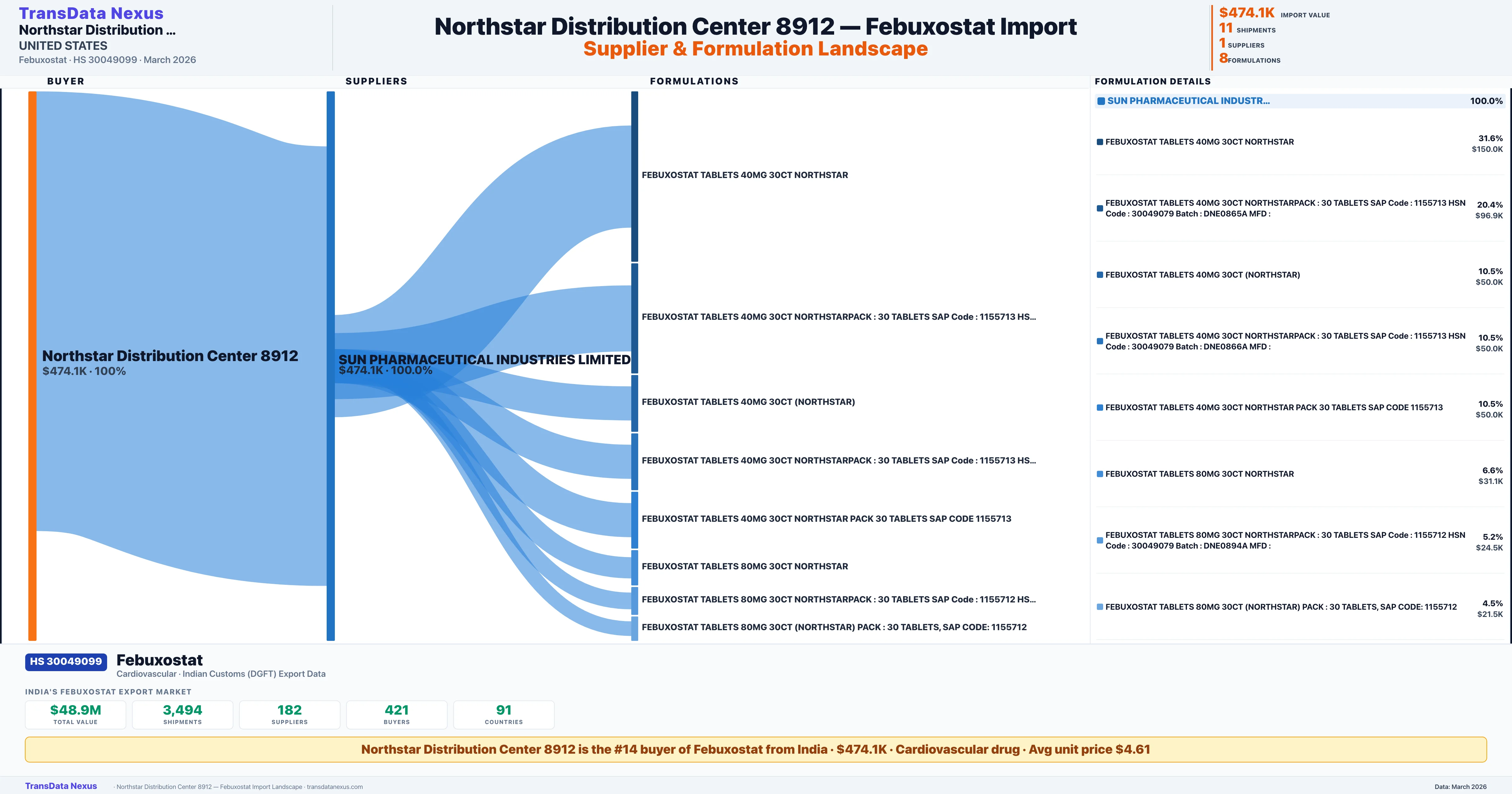 NORTHSTAR DISTRIBUTION CENTER 8912 sources Febuxostat from 1 verified Indian supplier: SUN PHARMACEUTICAL INDUSTRIES LIMITED ($474.1K, 100.0%). This is based on 11 customs records.