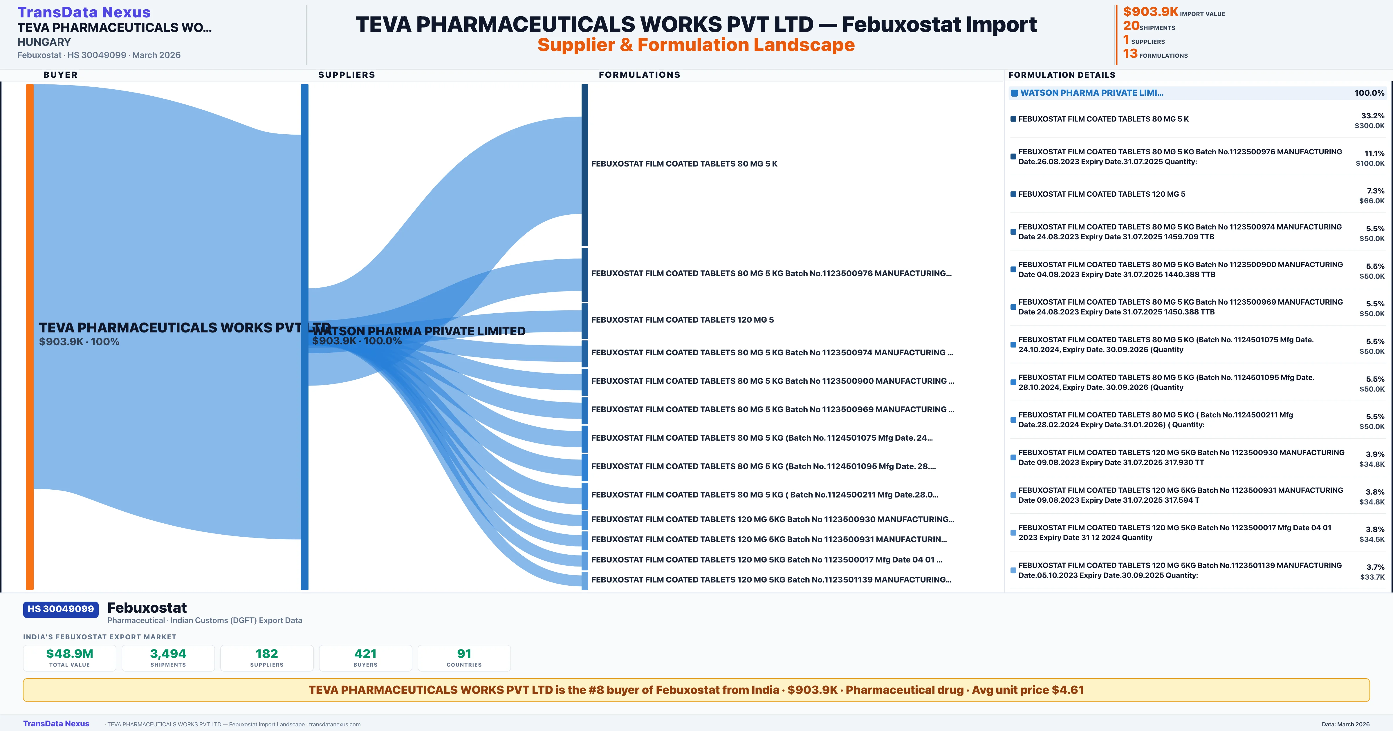 Access order-level details, pricing data, supplier connections, and competitive analysis for TEVA PHARMACEUTICALS WORKS PVT LTD's Febuxostat imports. TransData Nexus provides verified Indian Customs (DGFT) data trusted by pharmaceutical trade professionals worldwide.