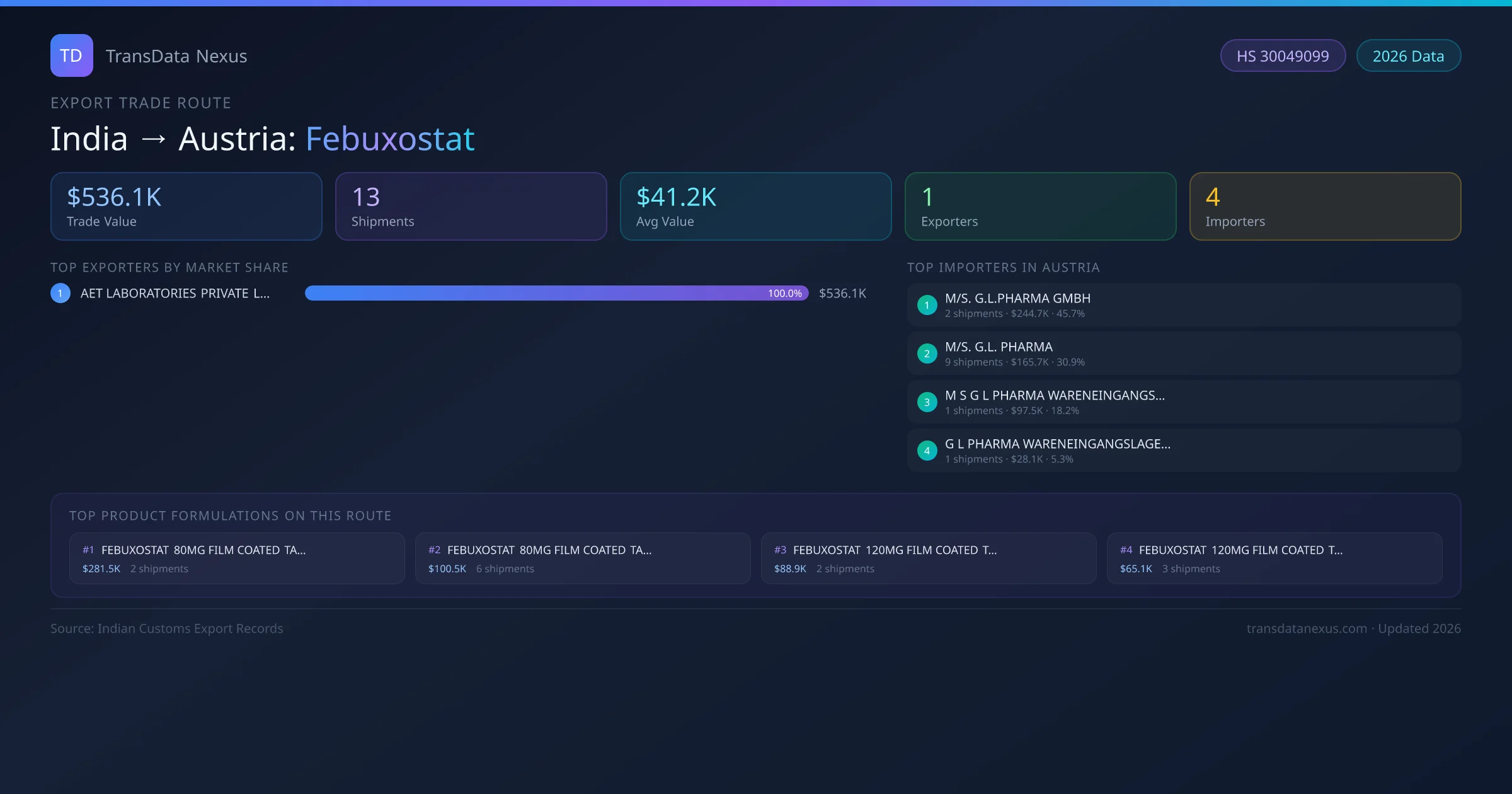- 1.Route Identification: India to Austria export trade corridor identified from Indian Customs (DGFT) records for Febuxostat.