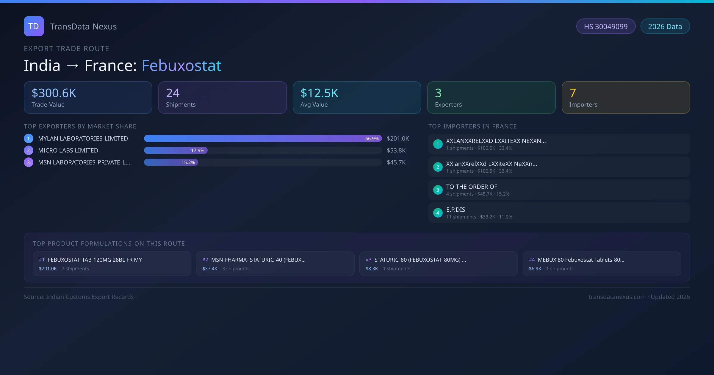 The India to France Febuxostat corridor is one of India's established pharmaceutical export routes, with 24 shipments documented worth a combined $300.6K USD. The route is dominated by MYLAN LABORATORIES LIMITED, which alone accounts for roughly 67% of all export value, reflecting the consolidated nature of India's febuxostat manufacturing sector.