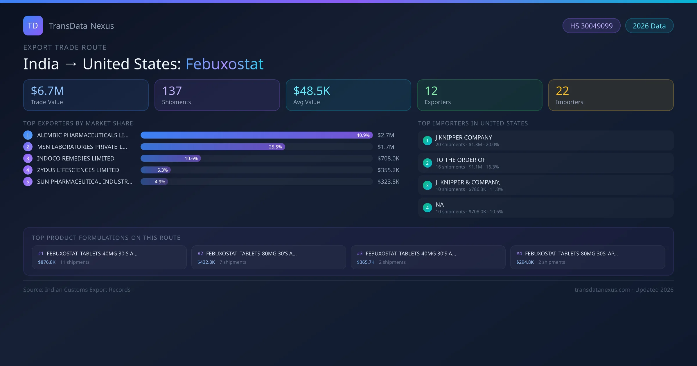 - 1.Route Identification: India to United States export trade corridor identified from Indian Customs (DGFT) records for Febuxostat.