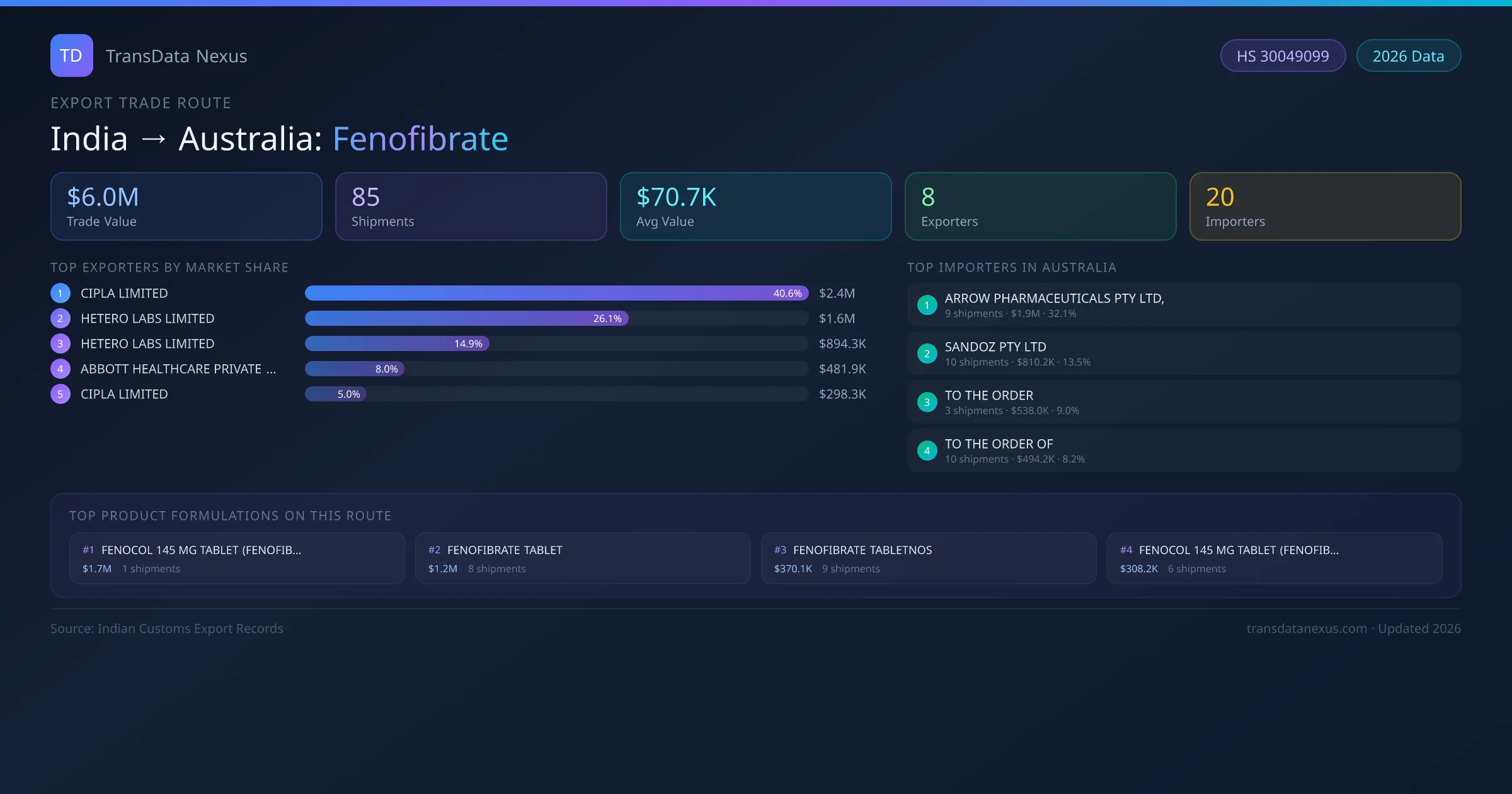- 1.Route Identification: India to Australia export trade corridor identified from Indian Customs (DGFT) records for Fenofibrate.