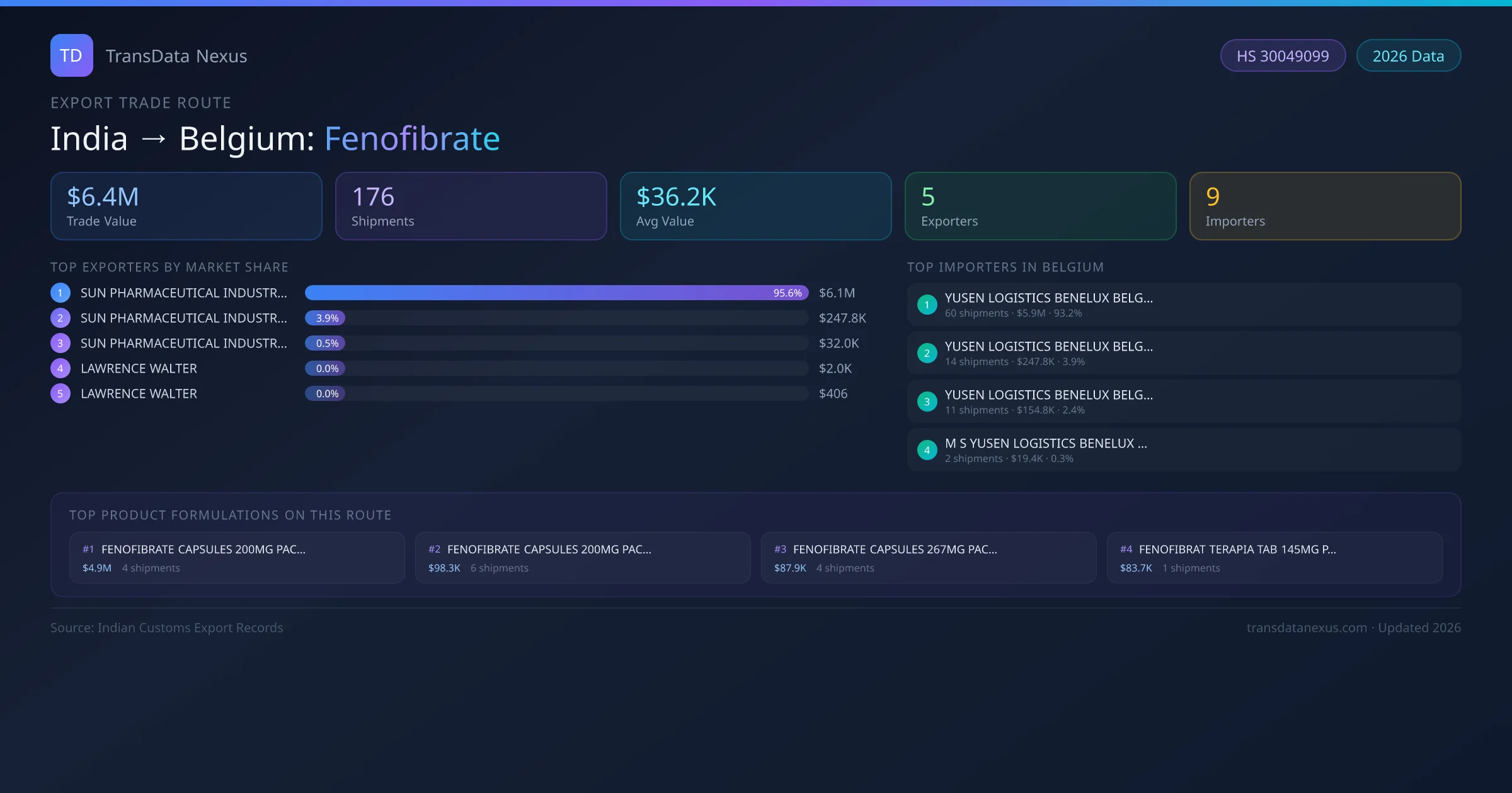 The India to Belgium Fenofibrate corridor is one of India's established pharmaceutical export routes, with 176 shipments documented worth a combined $6.4M USD. The route is dominated by SUN PHARMACEUTICAL INDUSTRIES LIMITED, which alone accounts for roughly 96% of all export value, reflecting the consolidated nature of India's fenofibrate manufacturing sector.