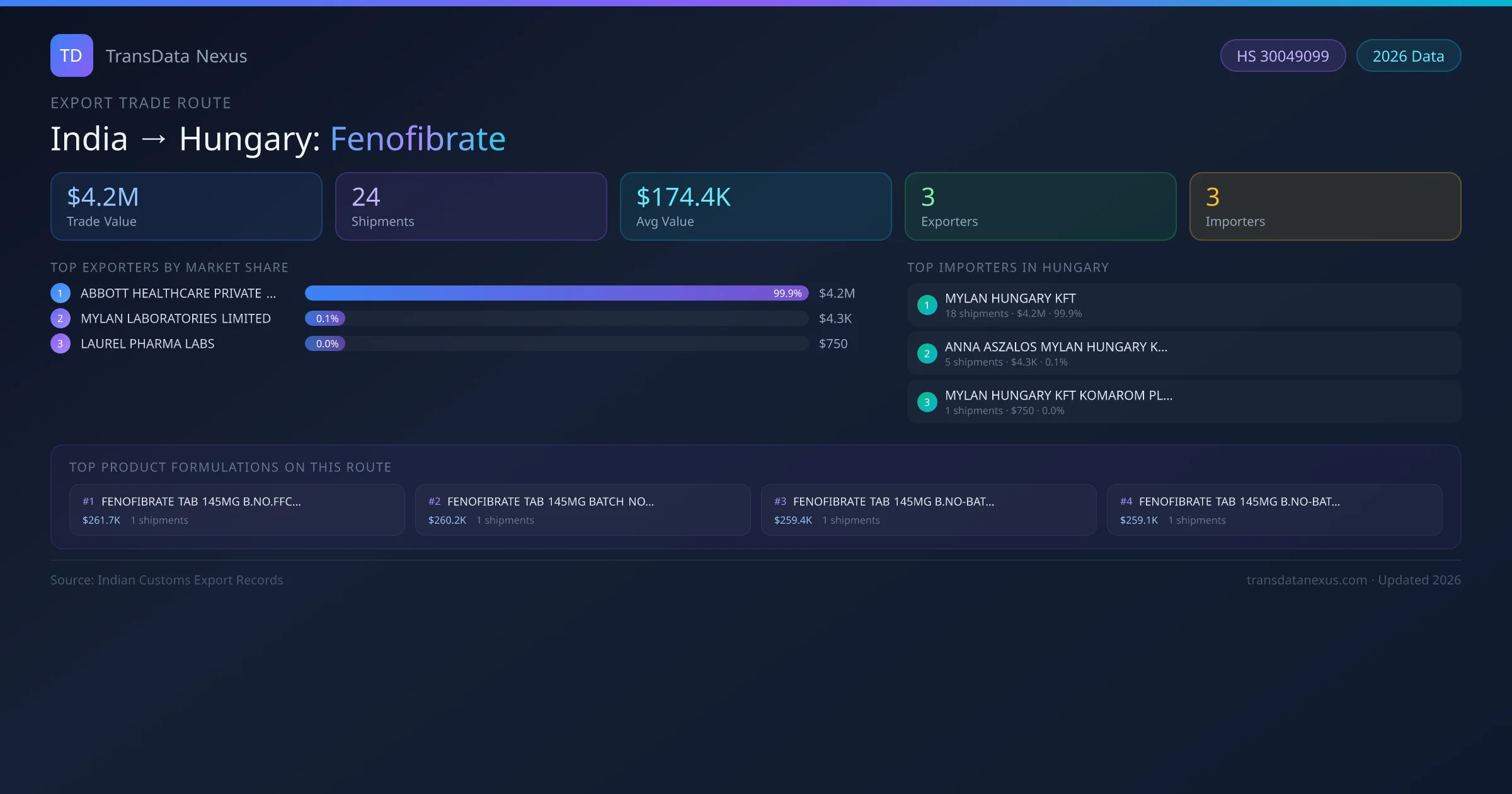 India has recorded 24 verified shipments of Fenofibrate exported to Hungary, representing a combined trade value of $4.2M USD. This corridor is served by 3 active Indian exporters, with an average shipment value of $174.4K USD. The leading Indian exporter is ABBOTT HEALTHCARE PRIVATE LIMITED, which accounts for 100% of total export value with 18 shipments worth $4.2M USD. On the buying side, MYLAN HUNGARY KFT is the largest importer in Hungary with $4.2M USD in purchases. The top 3 suppliers — ABBOTT HEALTHCARE PRIVATE LIMITED, MYLAN LABORATORIES LIMITED, LAUREL PHARMA LABS — together control 100% of total trade value on this route. All data sourced from Indian Customs (DGFT) shipping bill records. Values reported in FOB USD.