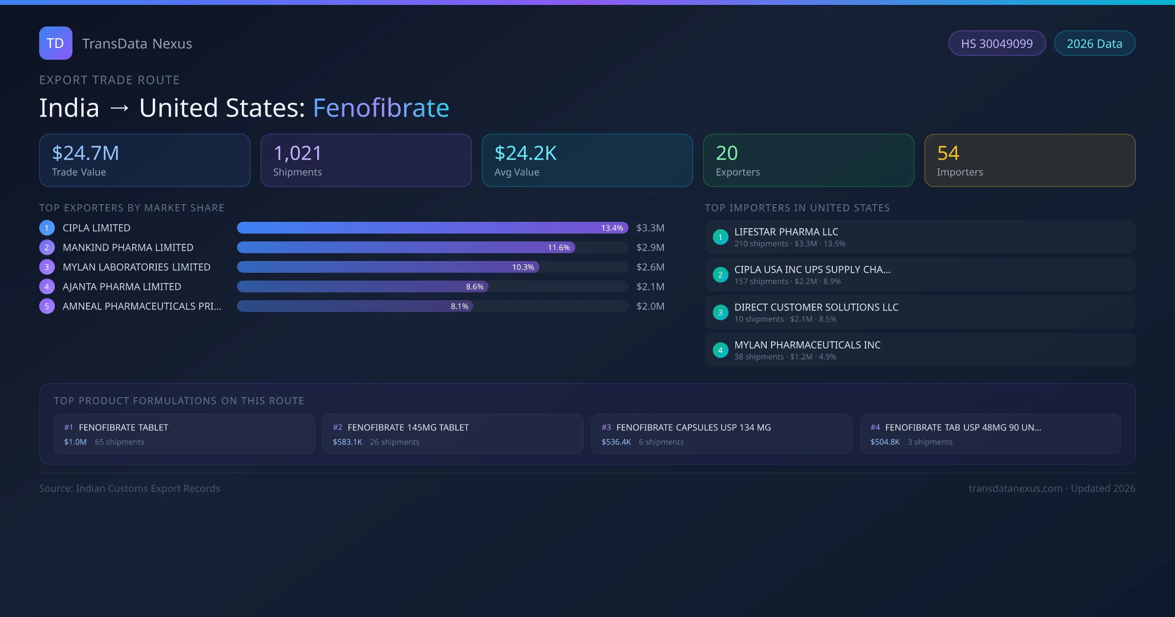 The India to United States Fenofibrate corridor is one of India's established pharmaceutical export routes, with 1,021 shipments documented worth a combined $24.7M USD. The route is dominated by CIPLA LIMITED, which alone accounts for roughly 13% of all export value, reflecting the consolidated nature of India's fenofibrate manufacturing sector.