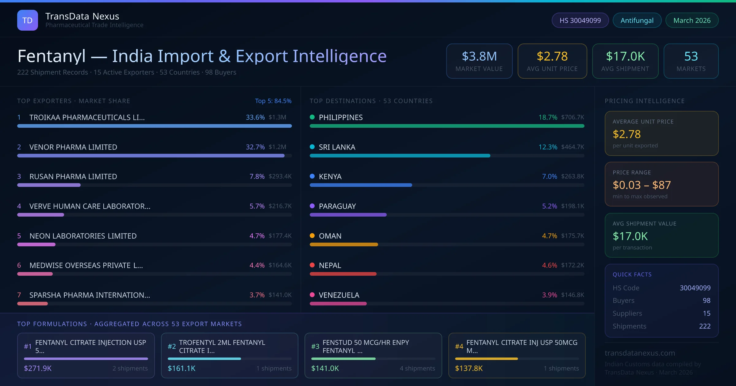 Between 2022 and 2026, India exported $3.8M worth of fentanyl across 222 verified shipments to 53 countries — covering 27% of world markets in the Analgesics & Antipyretics segment. The largest destination is PHILIPPINES (18.7%). TROIKAA PHARMACEUTICALS LIMITED leads with a 33.6% share. All figures are drawn from Indian Customs (DGFT) shipping bill records spanning four years of trade activity.