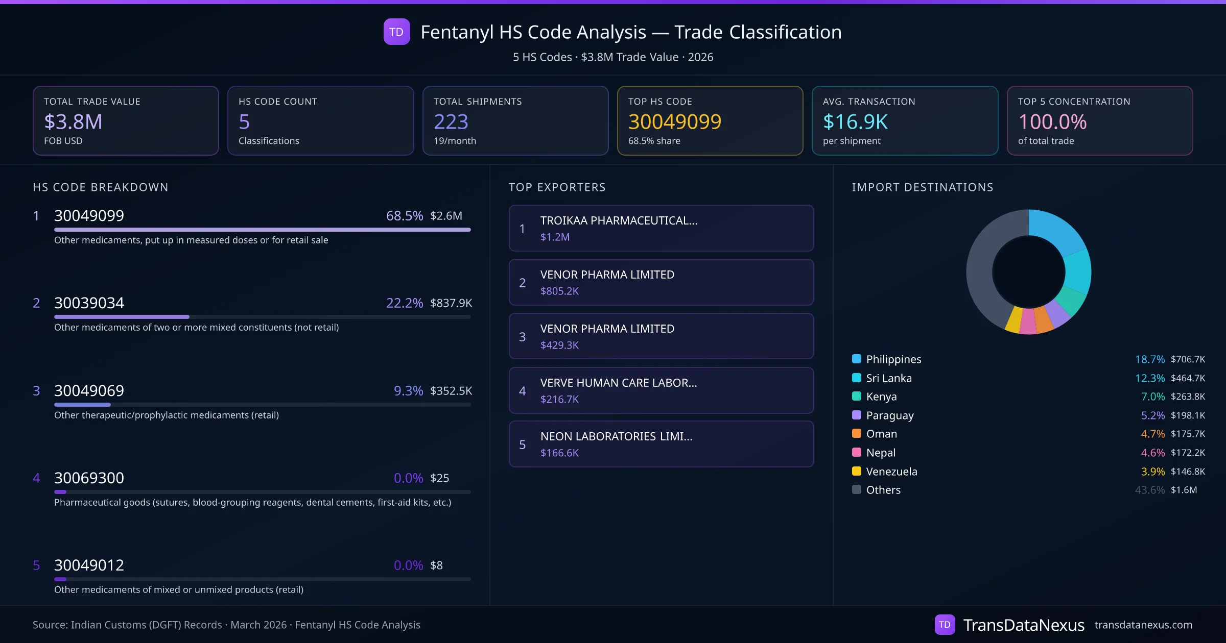 India exports Fentanyl under 5 distinct HS code classifications, representing a total trade value of $3.8M across 223 shipments. The dominant classification is HS 30049099 (Other medicaments, put up in measured doses or for retail sale), accounting for 68.5% of all Fentanyl trade at $2.6M. HS 30039034 (Other medicaments of two or more mixed constituents (not retail)) follows at 22.2% ($837.9K). The top 5 HS codes together account for 100.0% of total Fentanyl trade from India. The average transaction value is $16924. Key importing markets include Philippines, Sri Lanka, Kenya. Leading exporters include TROIKAA PHARMACEUTICALS LIMITED and VENOR PHARMA LIMITED. Data sourced from Indian Customs (DGFT) shipping bill records.