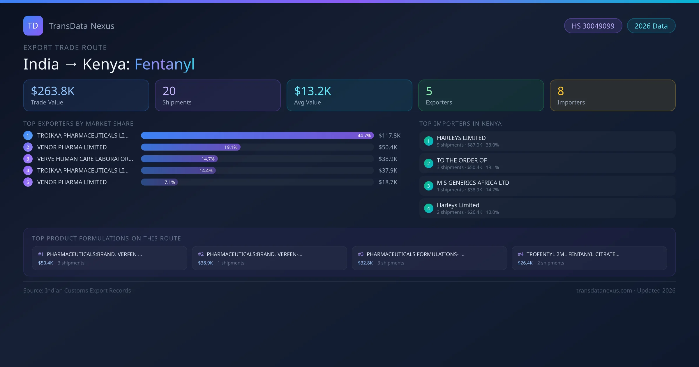 India has recorded 20 verified shipments of Fentanyl exported to Kenya, representing a combined trade value of $263.8K USD. This corridor is served by 5 active Indian exporters, with an average shipment value of $13.2K USD. The leading Indian exporter is TROIKAA PHARMACEUTICALS LIMITED, which accounts for 45% of total export value with 12 shipments worth $117.8K USD. On the buying side, HARLEYS LIMITED is the largest importer in Kenya with $87.0K USD in purchases. The top 3 suppliers — TROIKAA PHARMACEUTICALS LIMITED, VENOR PHARMA LIMITED, VERVE HUMAN CARE LABORATORIES — together control 79% of total trade value on this route. All data sourced from Indian Customs (DGFT) shipping bill records. Values reported in FOB USD.
