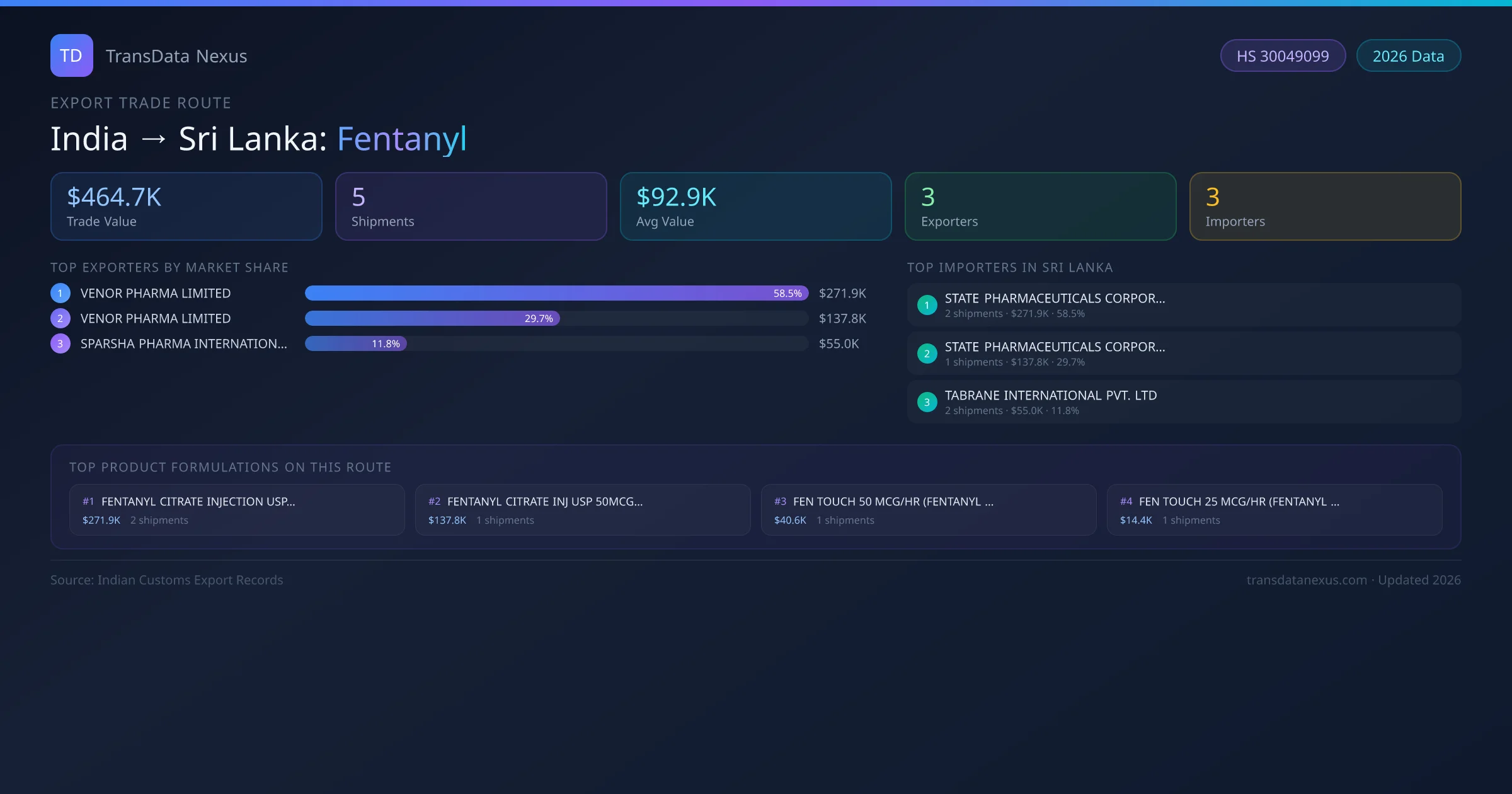 India has recorded 5 verified shipments of Fentanyl exported to Sri Lanka, representing a combined trade value of $464.7K USD. This corridor is served by 3 active Indian exporters, with an average shipment value of $92.9K USD. The leading Indian exporter is VENOR PHARMA LIMITED , which accounts for 59% of total export value with 2 shipments worth $271.9K USD. On the buying side, STATE PHARMACEUTICALS CORPORATION is the largest importer in Sri Lanka with $271.9K USD in purchases. The top 3 suppliers — VENOR PHARMA LIMITED , VENOR PHARMA LIMITED, SPARSHA PHARMA INTERNATIONAL PRIVATE LIMITED — together control 100% of total trade value on this route. All data sourced from Indian Customs (DGFT) shipping bill records. Values reported in FOB USD.