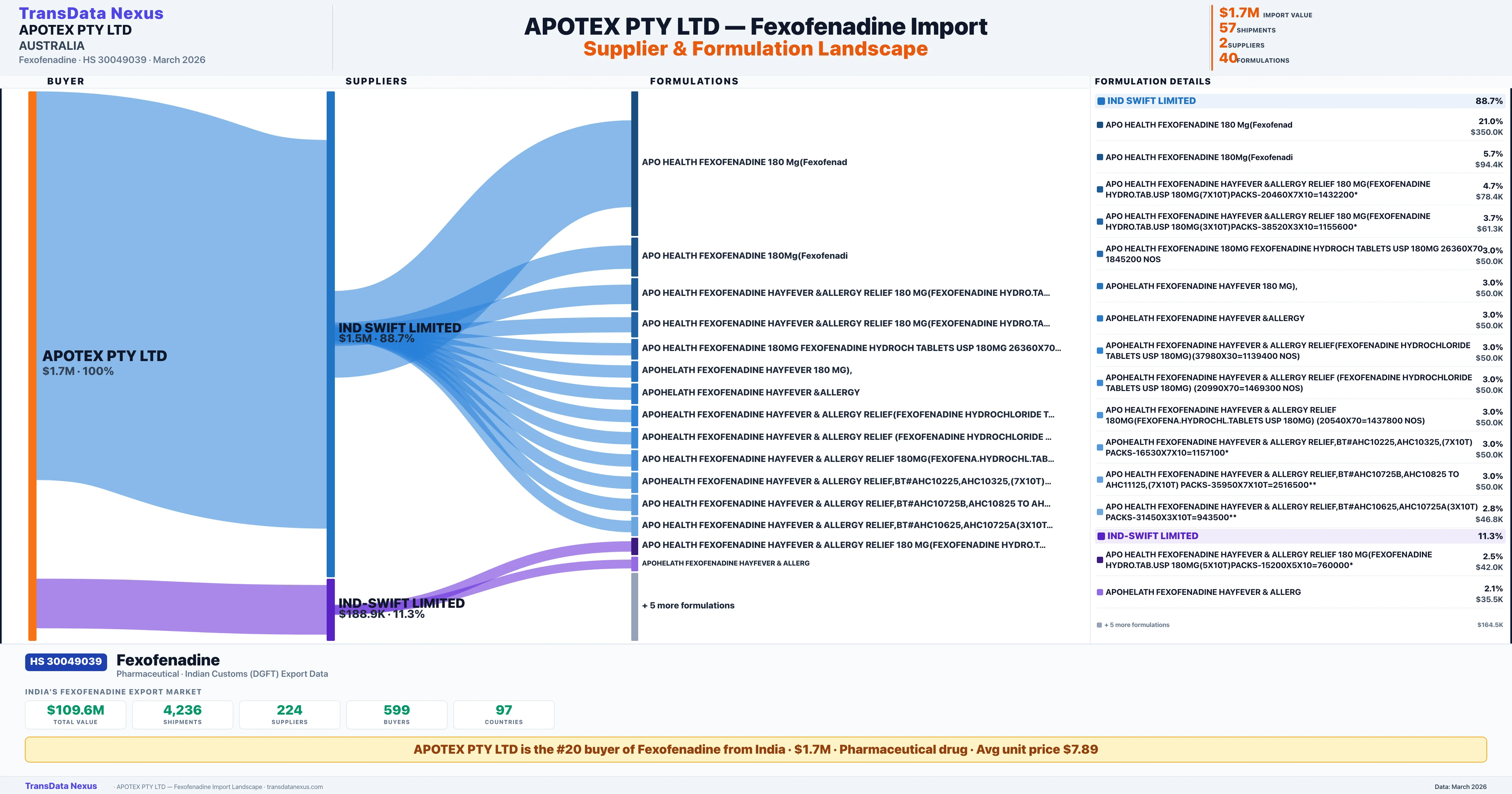 APOTEX PTY LTD sources Fexofenadine from 2 verified Indian suppliers: IND SWIFT LIMITED ($1.5M, 88.7%), IND-SWIFT LIMITED ($188.9K, 11.3%). This is based on 57 customs records.