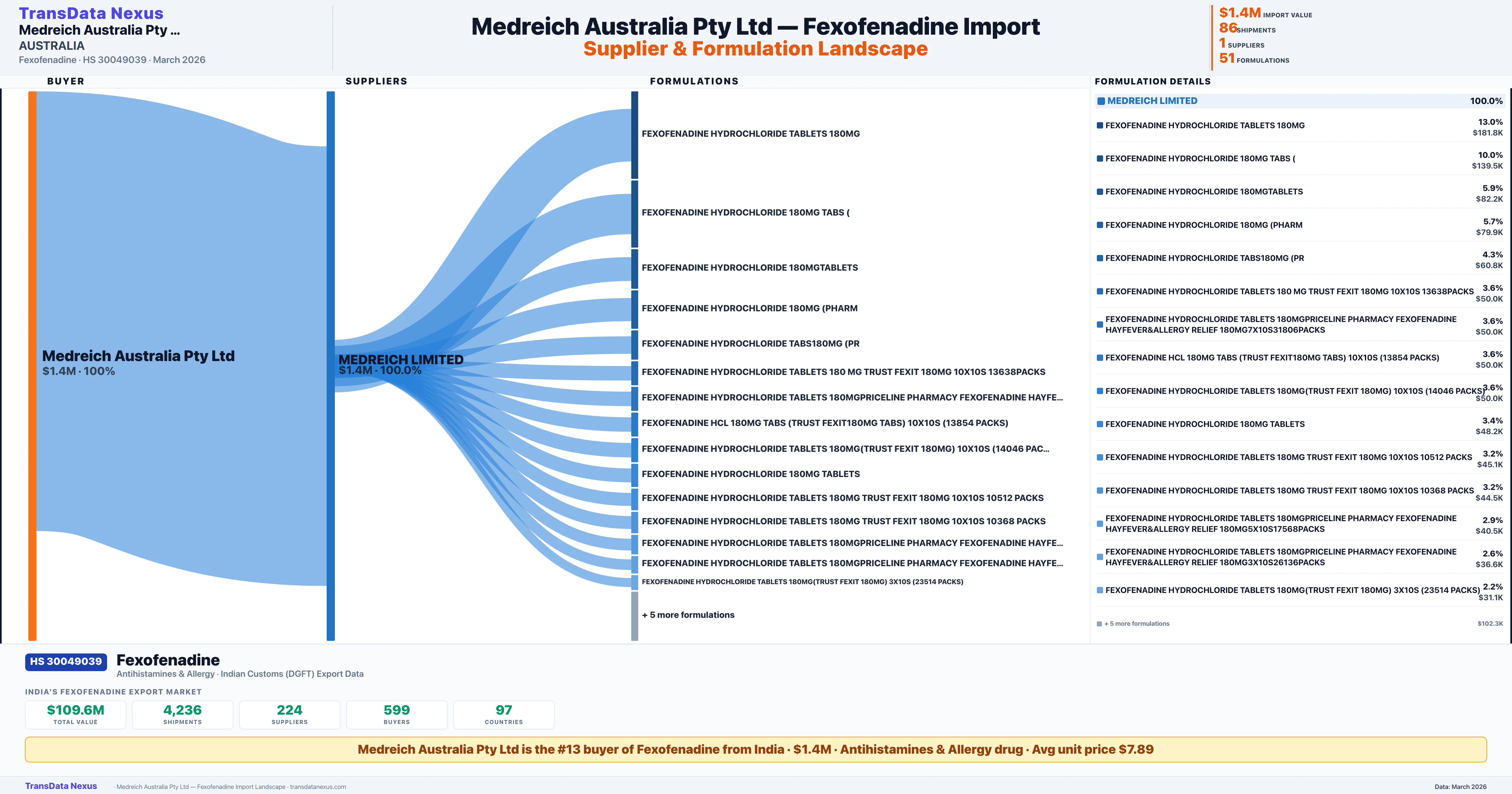 MEDREICH AUSTRALIA PTY LTD sources Fexofenadine from 1 verified Indian supplier: MEDREICH LIMITED ($1.4M, 100.0%). This is based on 86 customs records.
