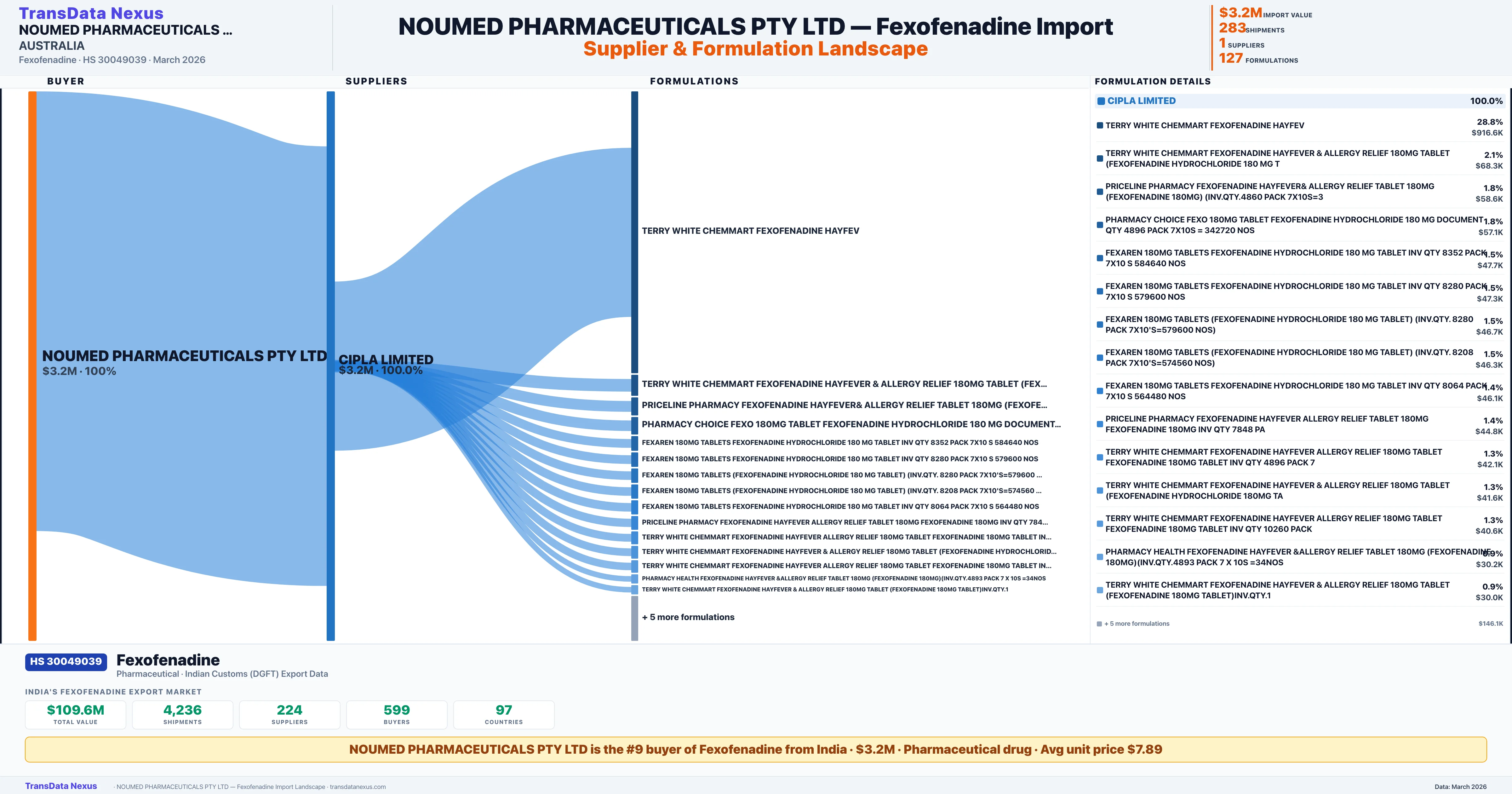 NOUMED PHARMACEUTICALS PTY LTD sources Fexofenadine from 1 verified Indian supplier: CIPLA LIMITED ($3.2M, 100.0%). This is based on 283 customs records.