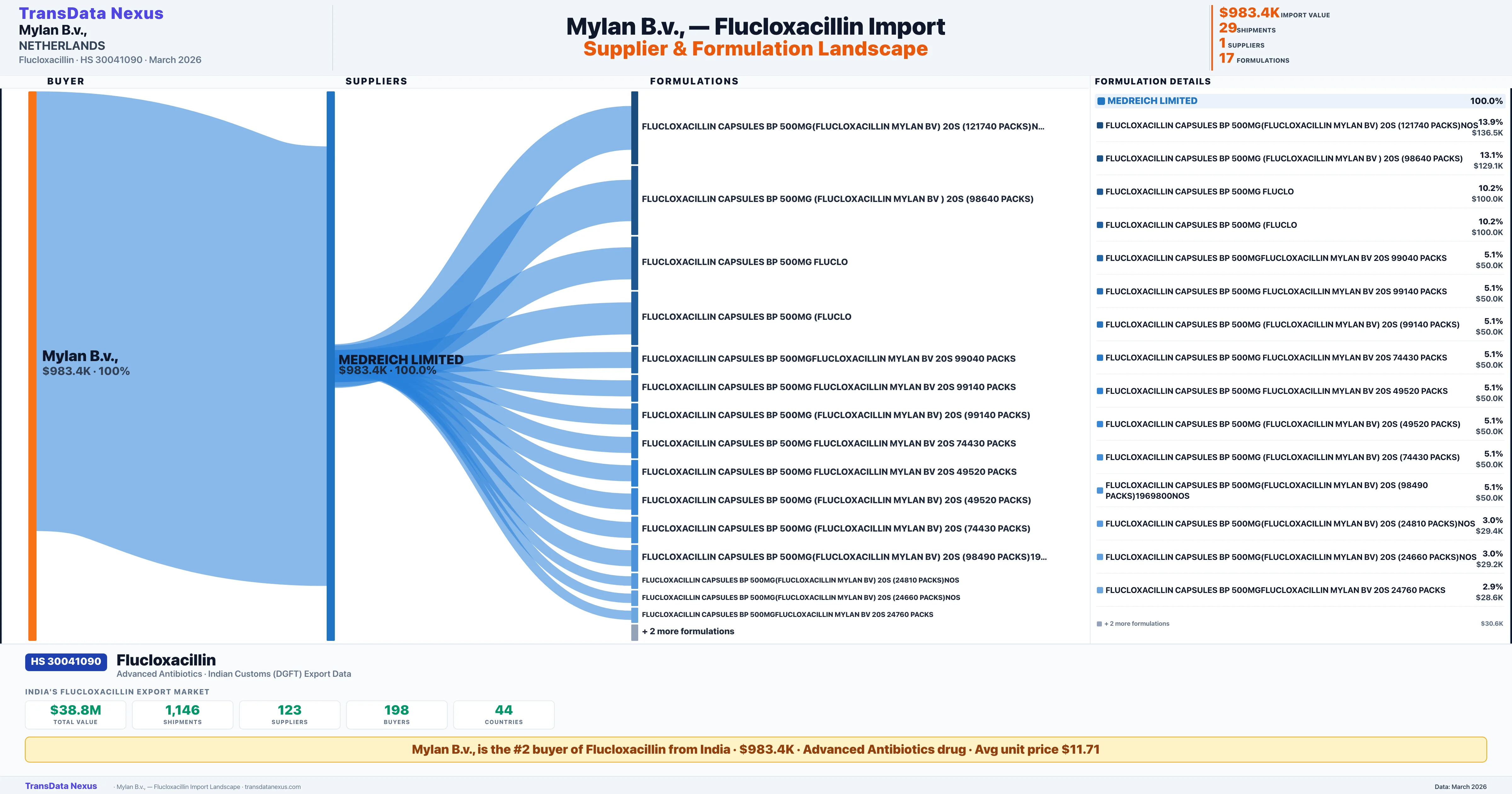 MYLAN B.V sources Flucloxacillin from 1 verified Indian supplier: MEDREICH LIMITED ($983.4K, 100.0%). This is based on 29 customs records.