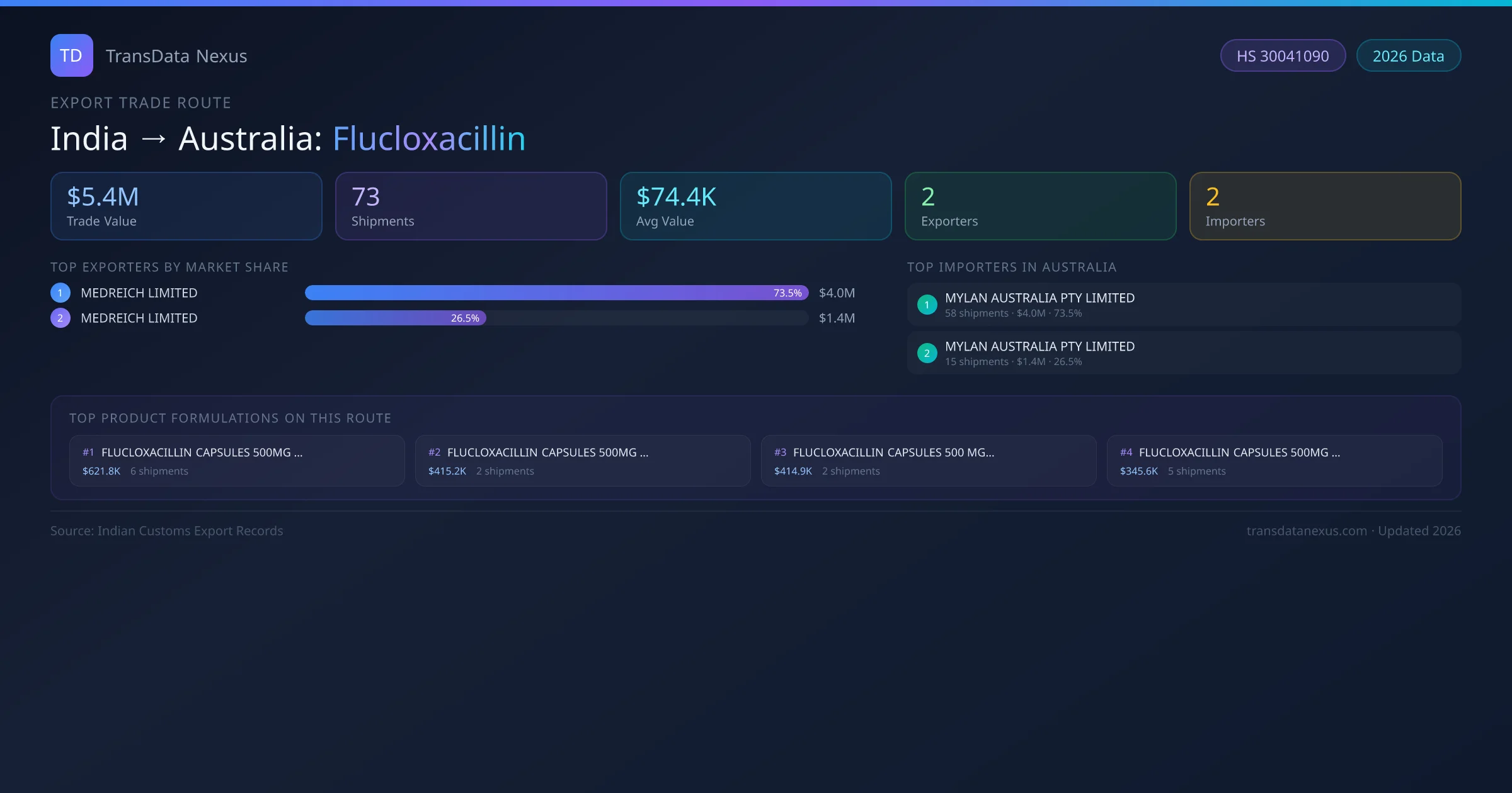 India has recorded 73 verified shipments of Flucloxacillin exported to Australia, representing a combined trade value of $5.4M USD. This corridor is served by 2 active Indian exporters, with an average shipment value of $74.4K USD. The leading Indian exporter is MEDREICH LIMITED, which accounts for 74% of total export value with 58 shipments worth $4.0M USD. On the buying side, MYLAN AUSTRALIA PTY LIMITED is the largest importer in Australia with $4.0M USD in purchases. All data sourced from Indian Customs (DGFT) shipping bill records. Values reported in FOB USD.