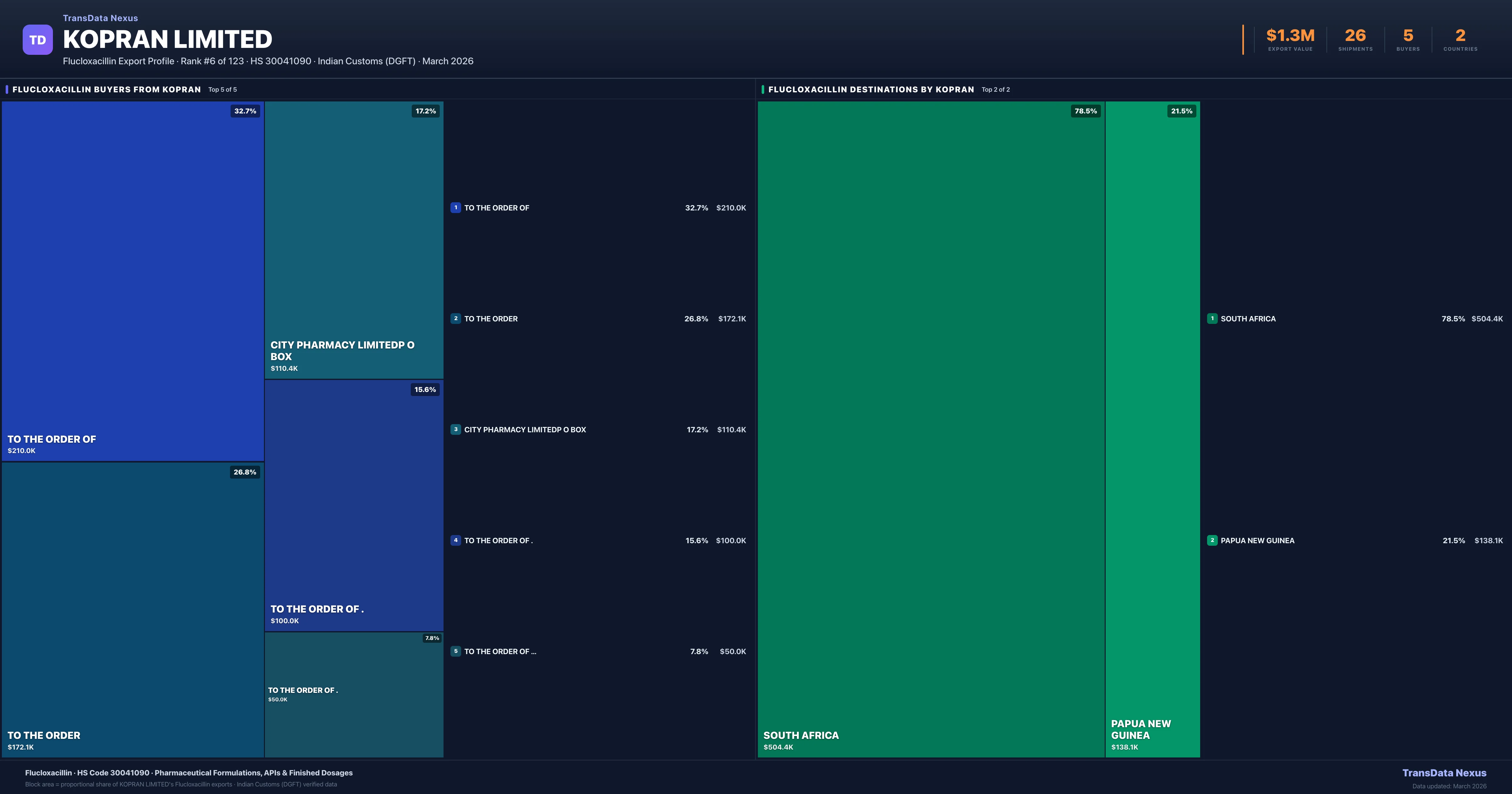 Kopran Limited supplies Flucloxacillin to 5 buyers globally. The largest buyer is TO THE ORDER OF (SOUTH AFRICA), followed by TO THE ORDER (PAPUA NEW GUINEA) and CITY PHARMACY LIMITEDP O BOX (PAPUA NEW GUINEA). These buyers represent pharmaceutical distributors, hospital groups, and government procurement agencies in their respective markets.