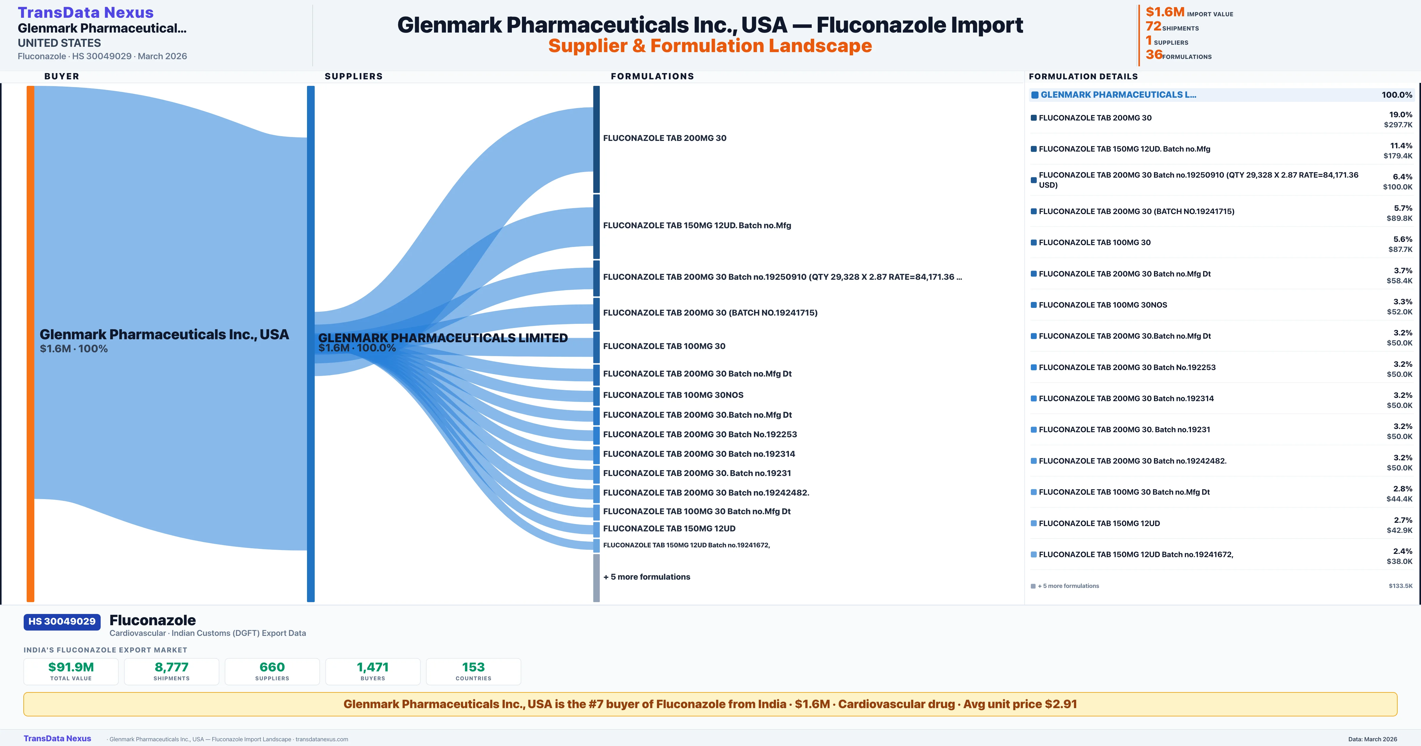 GLENMARK PHARMACEUTICALS INC., USA sources Fluconazole from 1 verified Indian supplier: GLENMARK PHARMACEUTICALS LIMITED ($1.6M, 100.0%). This is based on 72 customs records.