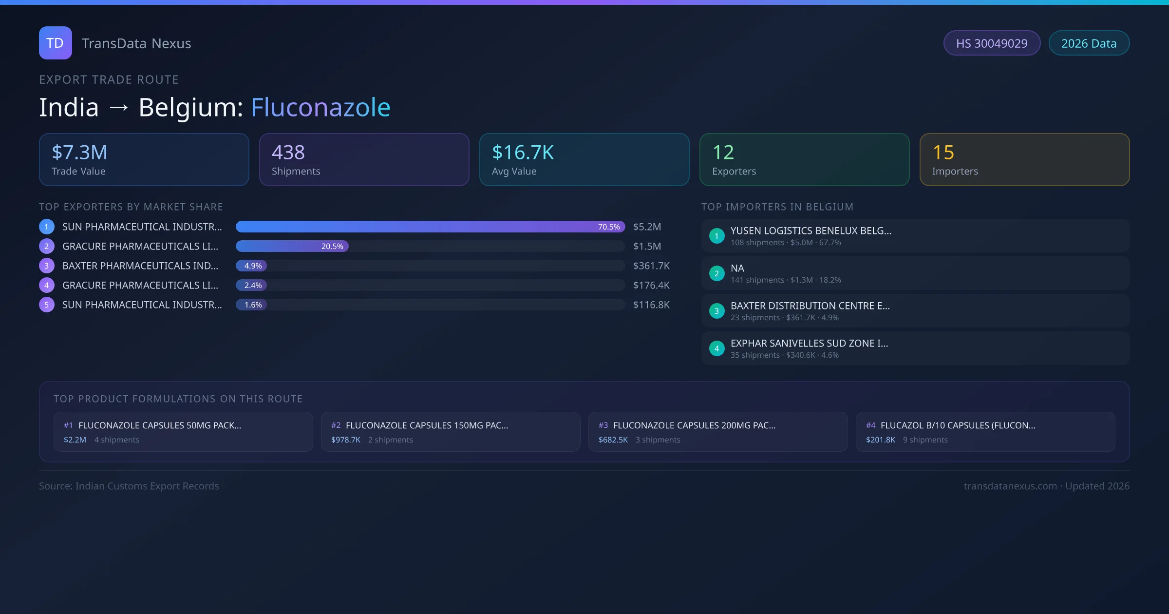 India exports Fluconazole to Belgium worth approximately $7.3M USD across 438 recorded shipments. The average value per shipment is $16.7K USD.