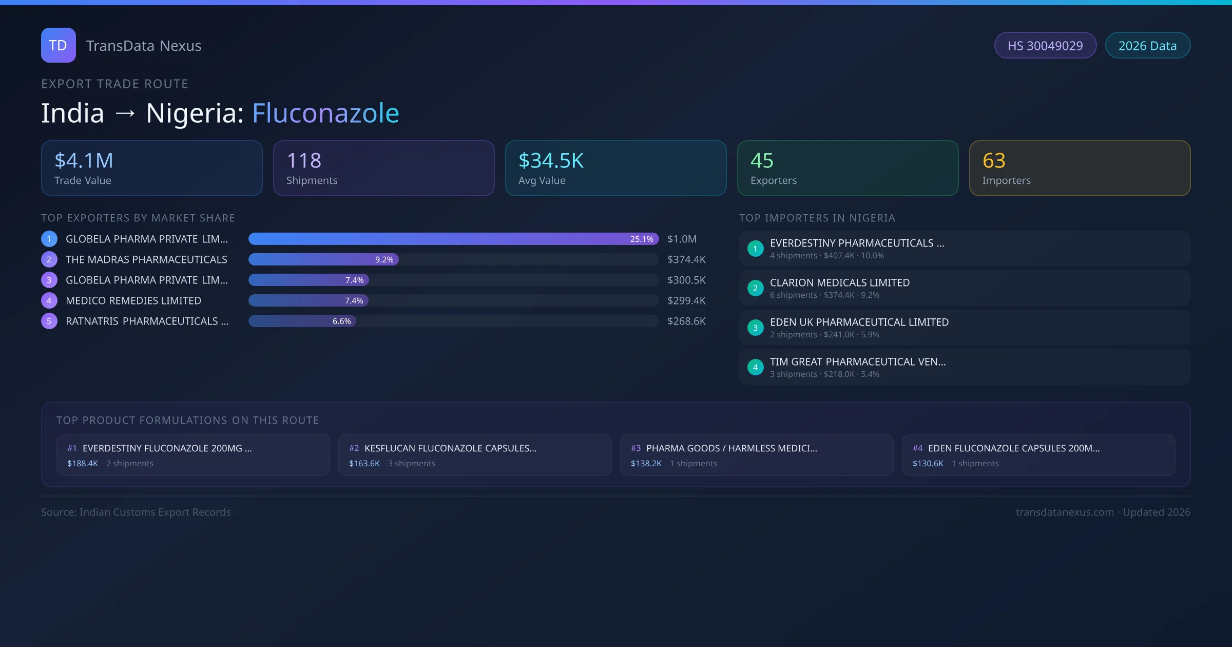 India exports Fluconazole to Nigeria worth approximately $4.1M USD across 118 recorded shipments. The average value per shipment is $34.5K USD.