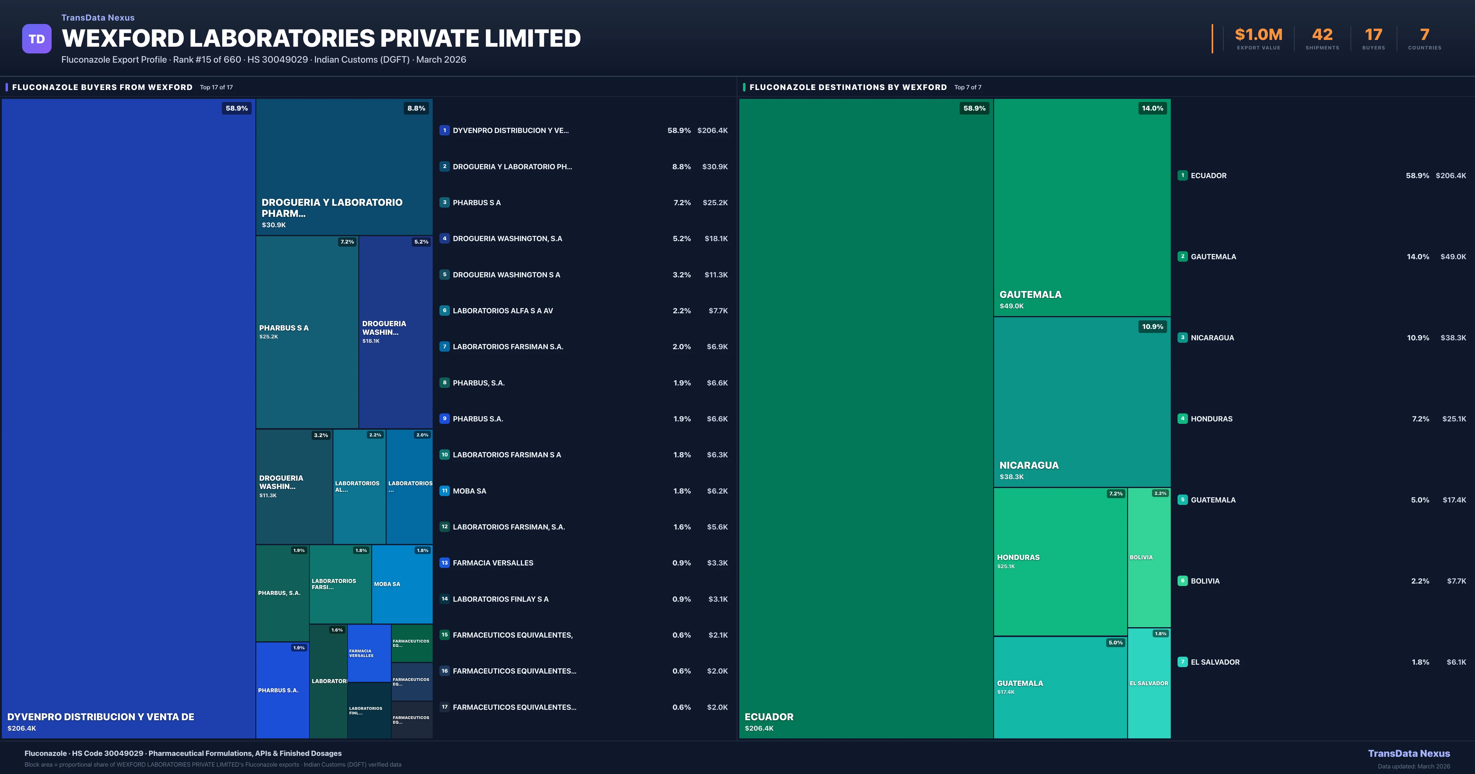 Wexford Laboratories Private Limited supplies Fluconazole to 17 buyers globally. The largest buyer is DYVENPRO DISTRIBUCION Y VENTA DE (ECUADOR), followed by DROGUERIA Y LABORATORIO PHARMALAT, (GAUTEMALA) and PHARBUS S A (NICARAGUA). These buyers represent pharmaceutical distributors, hospital groups, and government procurement agencies in their respective markets.