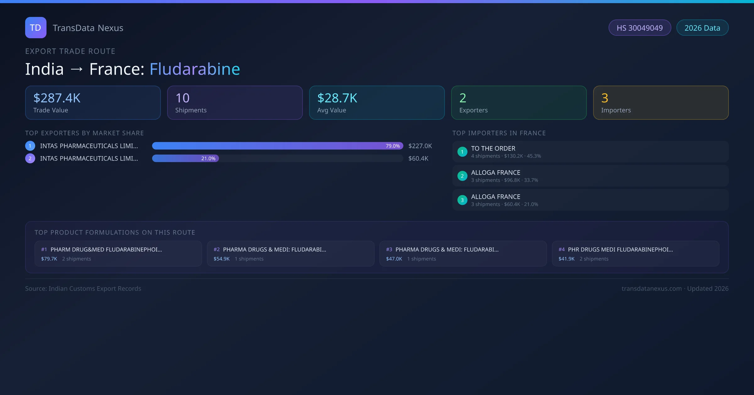 India has recorded 10 verified shipments of Fludarabine exported to France, representing a combined trade value of $287.4K USD. This corridor is served by 2 active Indian exporters, with an average shipment value of $28.7K USD. The leading Indian exporter is INTAS PHARMACEUTICALS LIMITED, which accounts for 79% of total export value with 7 shipments worth $227.0K USD. On the buying side, TO THE ORDER is the largest importer in France with $130.2K USD in purchases. All data sourced from Indian Customs (DGFT) shipping bill records. Values reported in FOB USD.