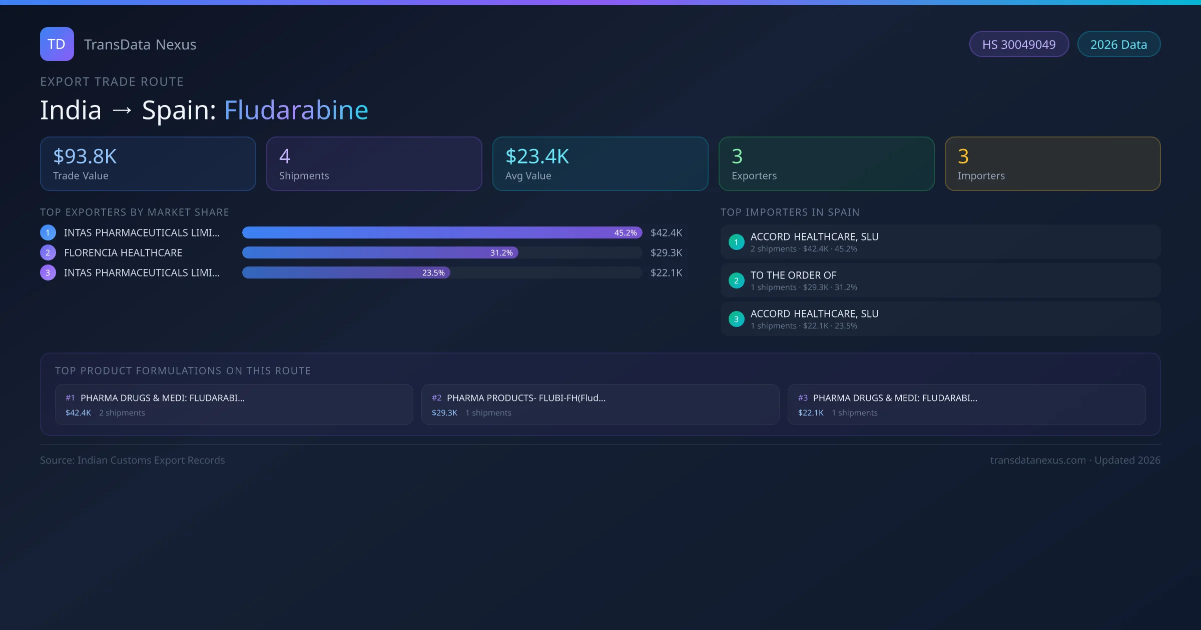 India has recorded 4 verified shipments of Fludarabine exported to Spain, representing a combined trade value of $93.8K USD. This corridor is served by 3 active Indian exporters, with an average shipment value of $23.4K USD. The leading Indian exporter is INTAS PHARMACEUTICALS LIMITED , which accounts for 45% of total export value with 2 shipments worth $42.4K USD. On the buying side, ACCORD HEALTHCARE, SLU is the largest importer in Spain with $42.4K USD in purchases. The top 3 suppliers — INTAS PHARMACEUTICALS LIMITED , FLORENCIA HEALTHCARE, INTAS PHARMACEUTICALS LIMITED — together control 100% of total trade value on this route. All data sourced from Indian Customs (DGFT) shipping bill records. Values reported in FOB USD.