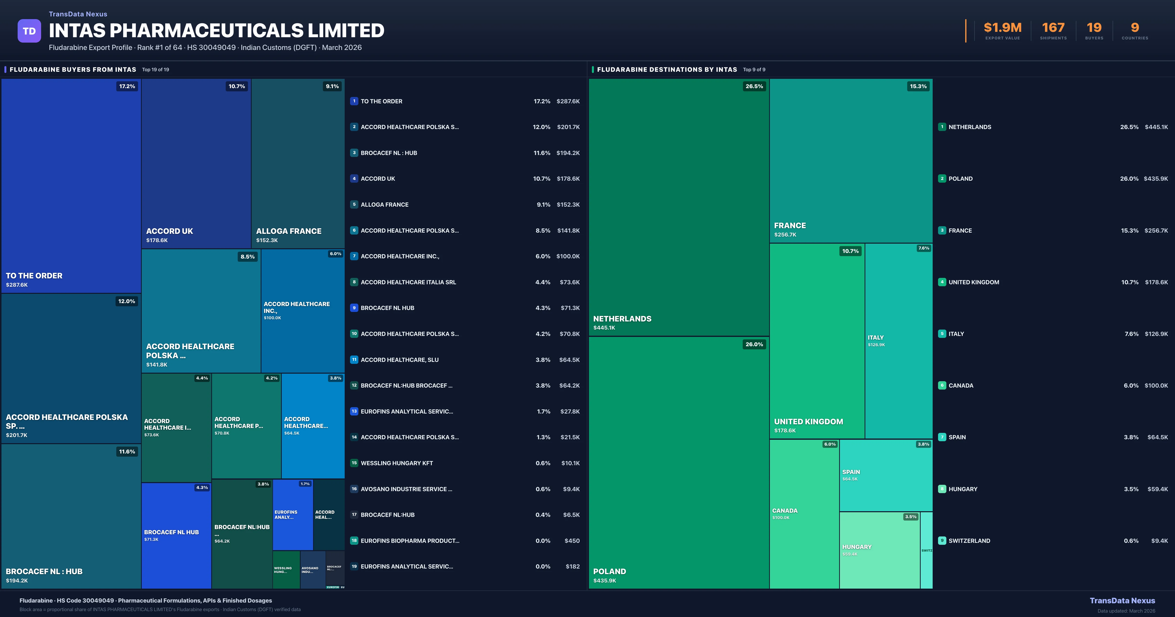 Intas Pharmaceuticals Limited supplies Fludarabine to 19 buyers globally. The largest buyer is TO THE ORDER (HUNGARY), followed by ACCORD HEALTHCARE POLSKA SP. Z O.O. (POLAND) and BROCACEF NL : HUB (NETHERLANDS). These buyers represent pharmaceutical distributors, hospital groups, and government procurement agencies in their respective markets.