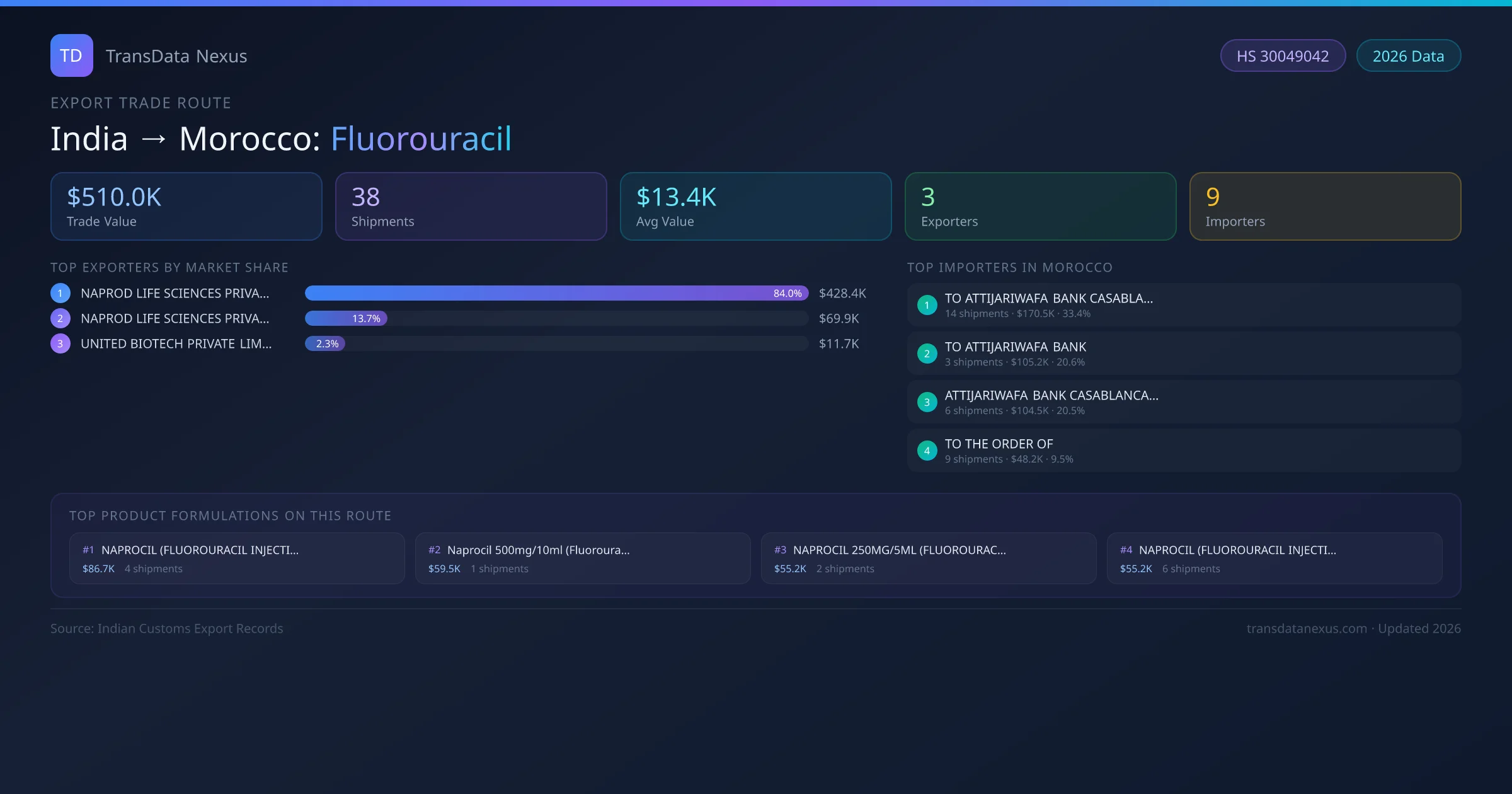 - 1.Route Identification: India to Morocco export trade corridor identified from Indian Customs (DGFT) records for Fluorouracil.