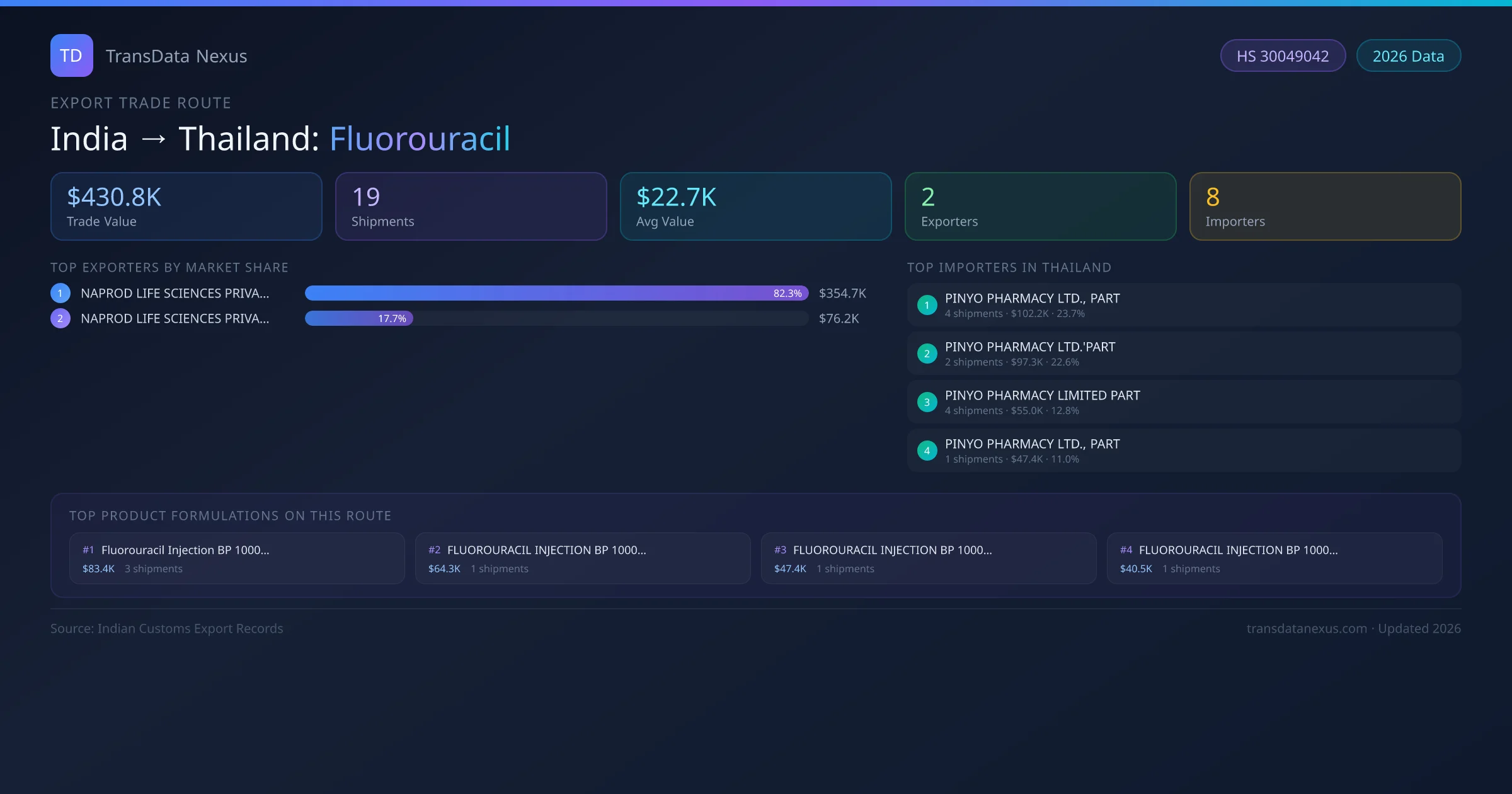 - 1.Route Identification: India to Thailand export trade corridor identified from Indian Customs (DGFT) records for Fluorouracil.