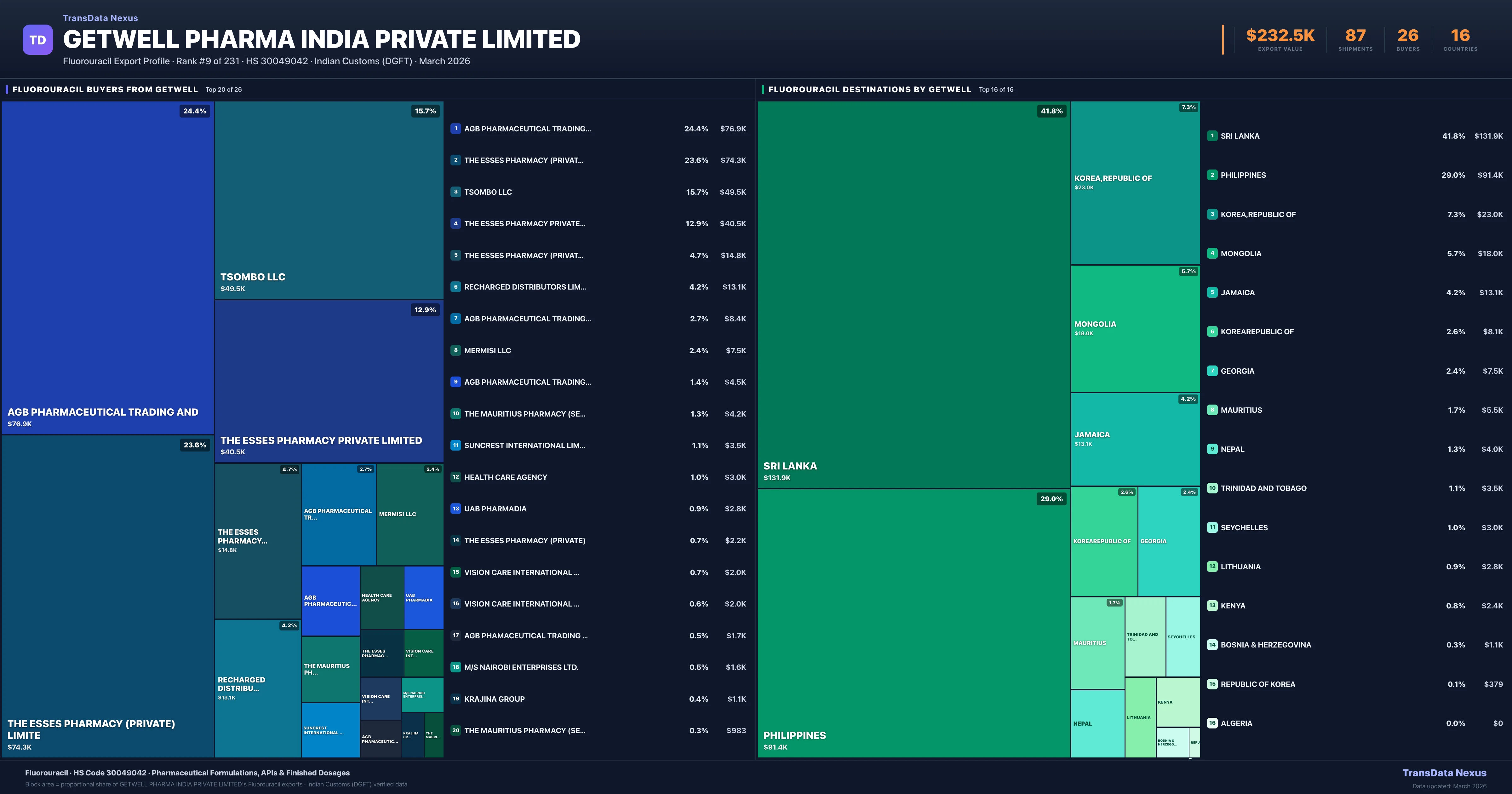 Getwell Pharma India Private Limited supplies Fluorouracil to 26 buyers globally. The largest buyer is AGB PHARMACEUTICAL TRADING AND (PHILIPPINES), followed by THE ESSES PHARMACY (PRIVATE) LIMITE (SRI LANKA) and TSOMBO LLC (KOREA,REPUBLIC OF). These buyers represent pharmaceutical distributors, hospital groups, and government procurement agencies in their respective markets.