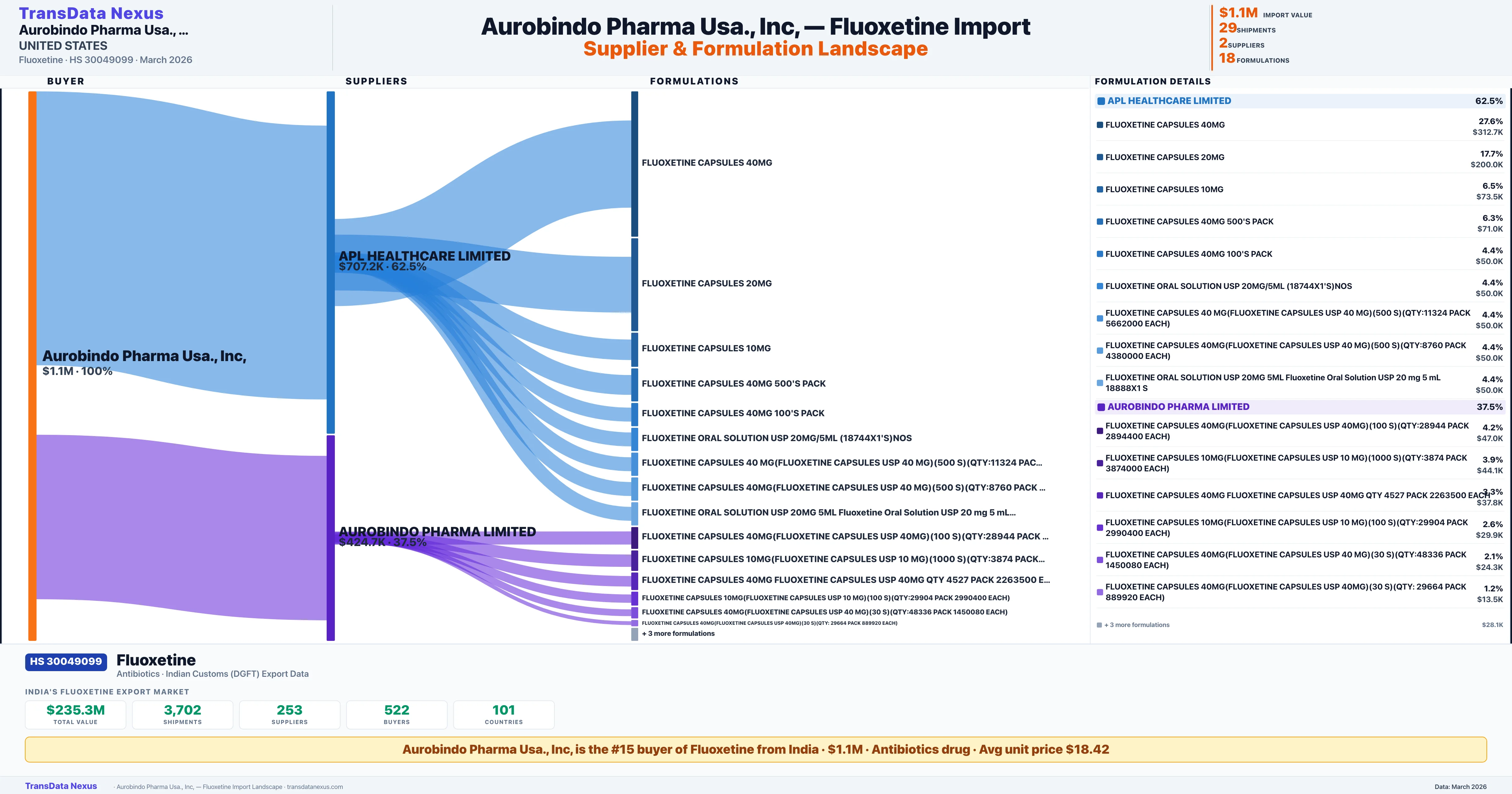 AUROBINDO PHARMA USA INC sources Fluoxetine from 2 verified Indian suppliers: APL HEALTHCARE LIMITED ($707.2K, 62.5%), AUROBINDO PHARMA LIMITED ($424.7K, 37.5%). This is based on 29 customs records.