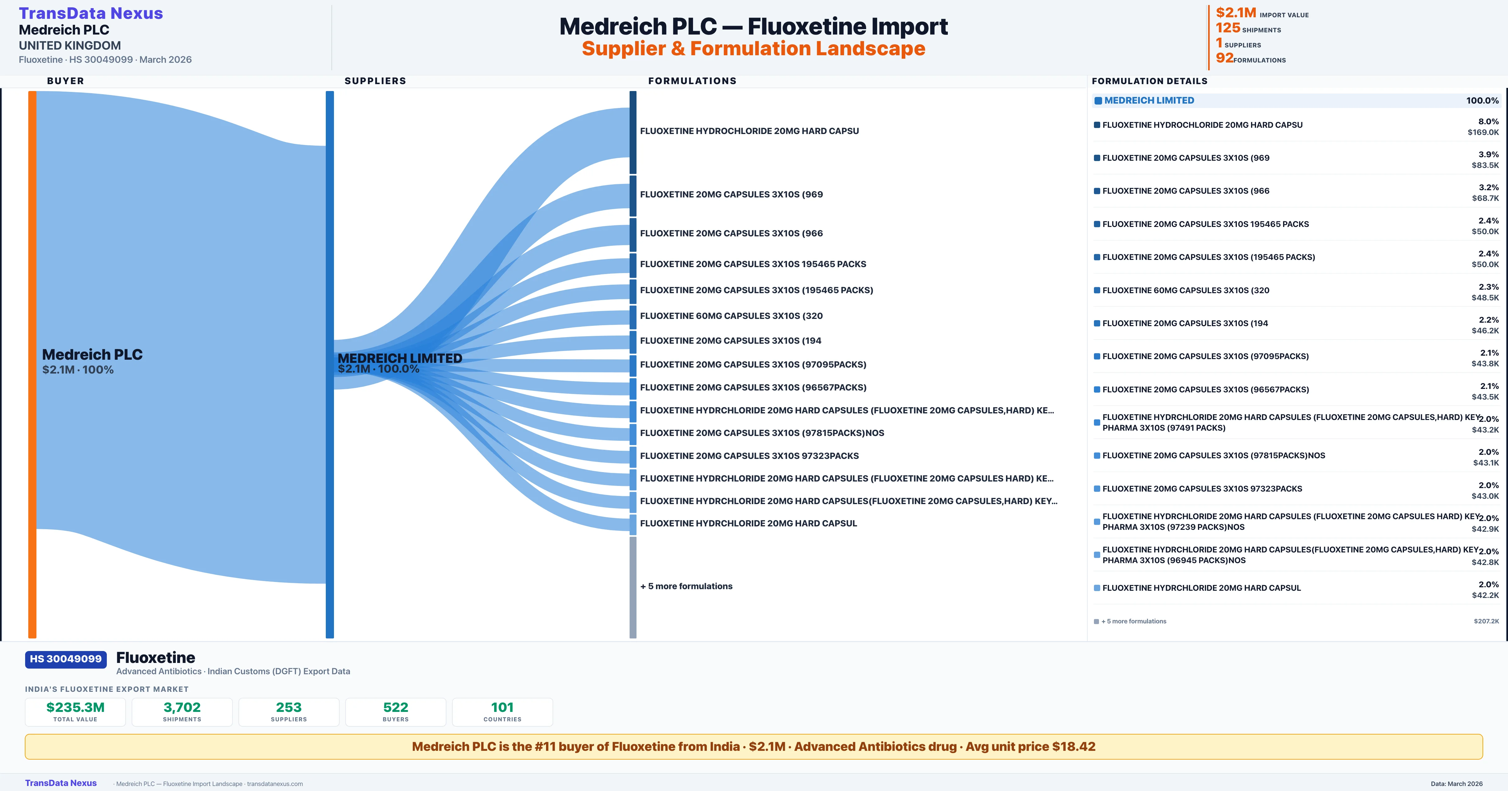MEDREICH PLC sources Fluoxetine from 1 verified Indian supplier: MEDREICH LIMITED ($2.1M, 100.0%). This is based on 125 customs records.
