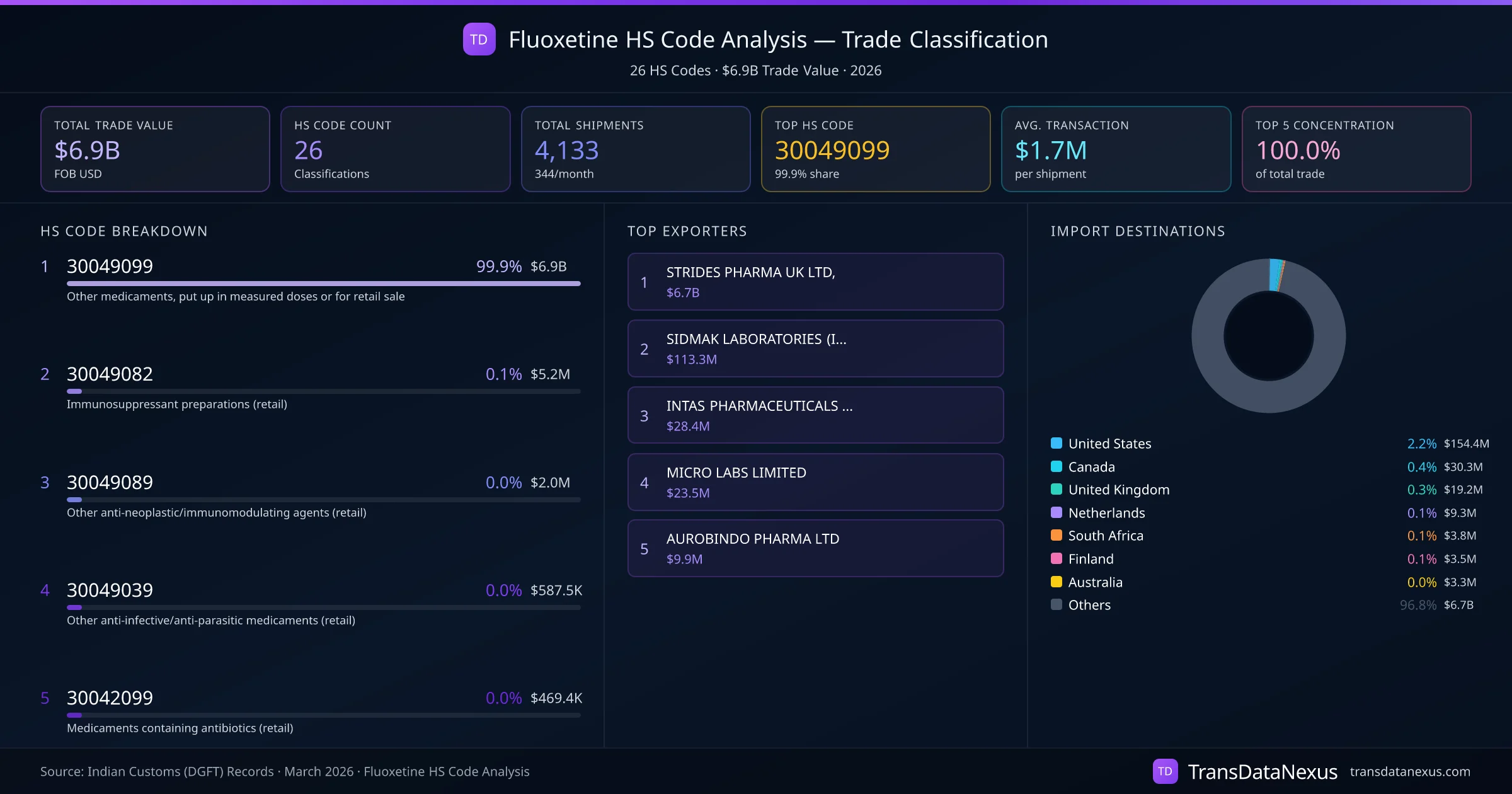 United States: The Most Favored Nation (MFN) tariff rate for products under HS code 30049099 is 0%, indicating duty-free entry. Additionally, Fluoxetine is listed on the World Health Organization's List of Essential Medicines, which may qualify it for exemptions or reduced tariffs under specific U.S. trade policies.