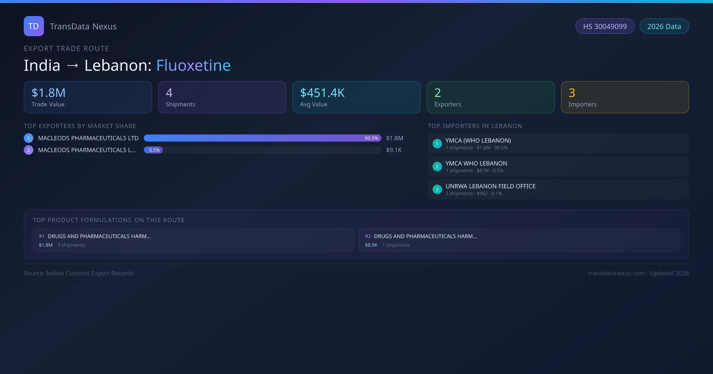 India has recorded 4 verified shipments of Fluoxetine exported to Lebanon, representing a combined trade value of $1.8M USD. This corridor is served by 2 active Indian exporters, with an average shipment value of $451.4K USD. The leading Indian exporter is MACLEODS PHARMACEUTICALS LTD, which accounts for 99% of total export value with 2 shipments worth $1.8M USD. On the buying side, YMCA (WHO LEBANON) is the largest importer in Lebanon with $1.8M USD in purchases. All data sourced from Indian Customs (DGFT) shipping bill records. Values reported in FOB USD.