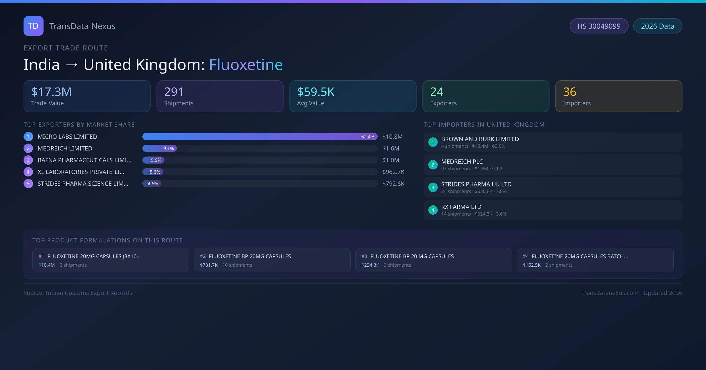 The India to United Kingdom Fluoxetine corridor is one of India's established pharmaceutical export routes, with 291 shipments documented worth a combined $17.3M USD. The route is dominated by MICRO LABS LIMITED, which alone accounts for roughly 62% of all export value, reflecting the consolidated nature of India's fluoxetine manufacturing sector.