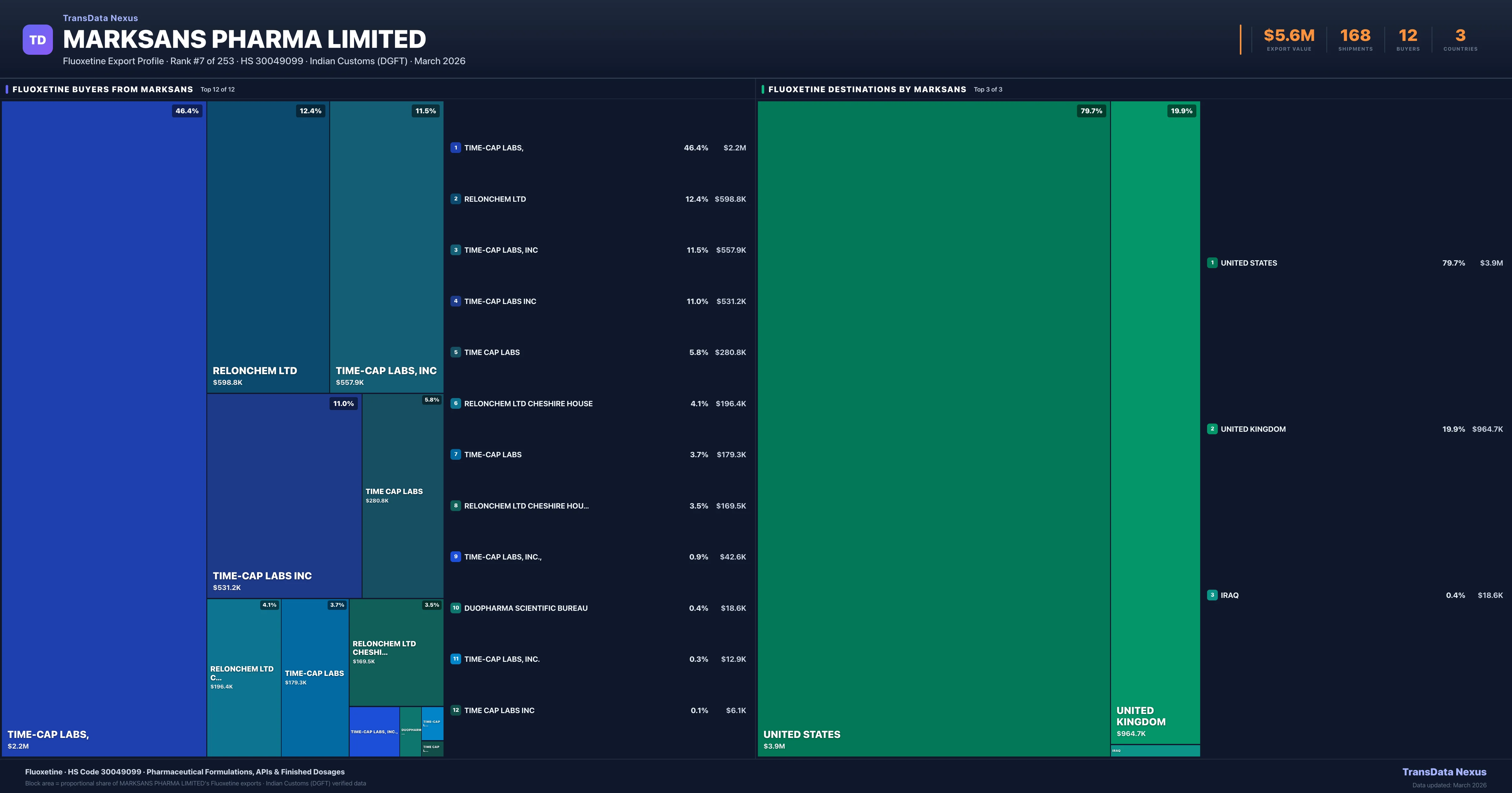 Marksans Pharma Limited supplies Fluoxetine to 12 buyers globally. The largest buyer is TIME-CAP LABS, (UNITED STATES), followed by RELONCHEM LTD (UNITED KINGDOM) and TIME-CAP LABS, INC (UNITED STATES). These buyers represent pharmaceutical distributors, hospital groups, and government procurement agencies in their respective markets.