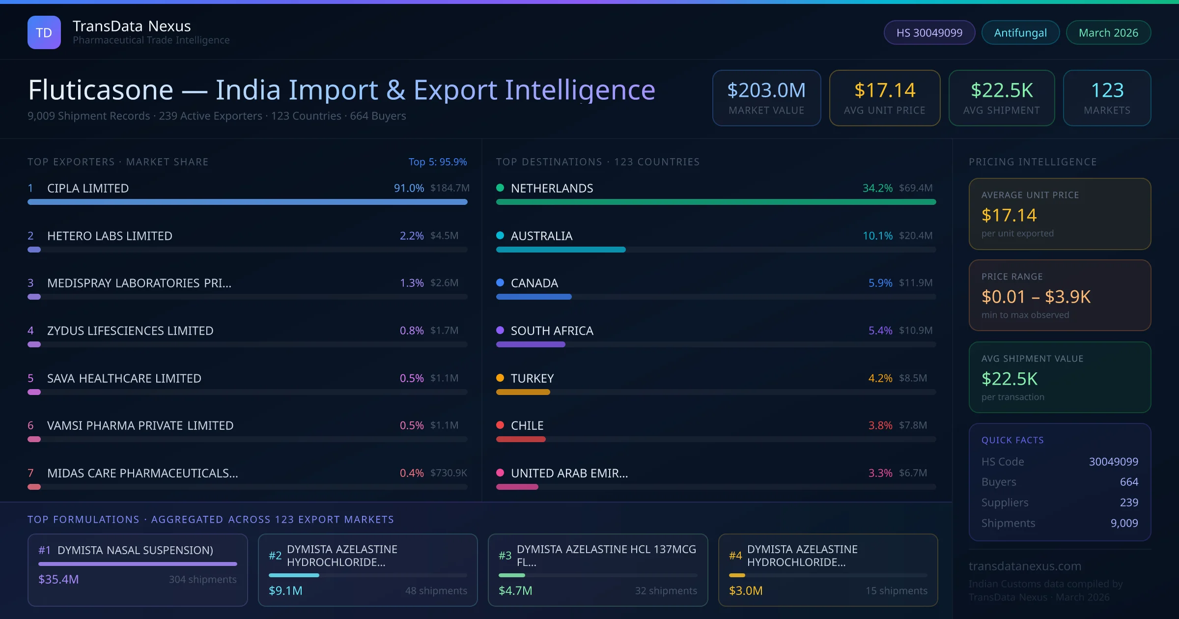 Between 2022 and 2026, India exported $203.0M worth of fluticasone across 9,009 verified shipments to 123 countries — covering 63% of world markets in the Respiratory segment. The largest destination is NETHERLANDS (34.2%). CIPLA LIMITED leads with a 91.0% share. All figures are drawn from Indian Customs (DGFT) shipping bill records spanning four years of trade activity.