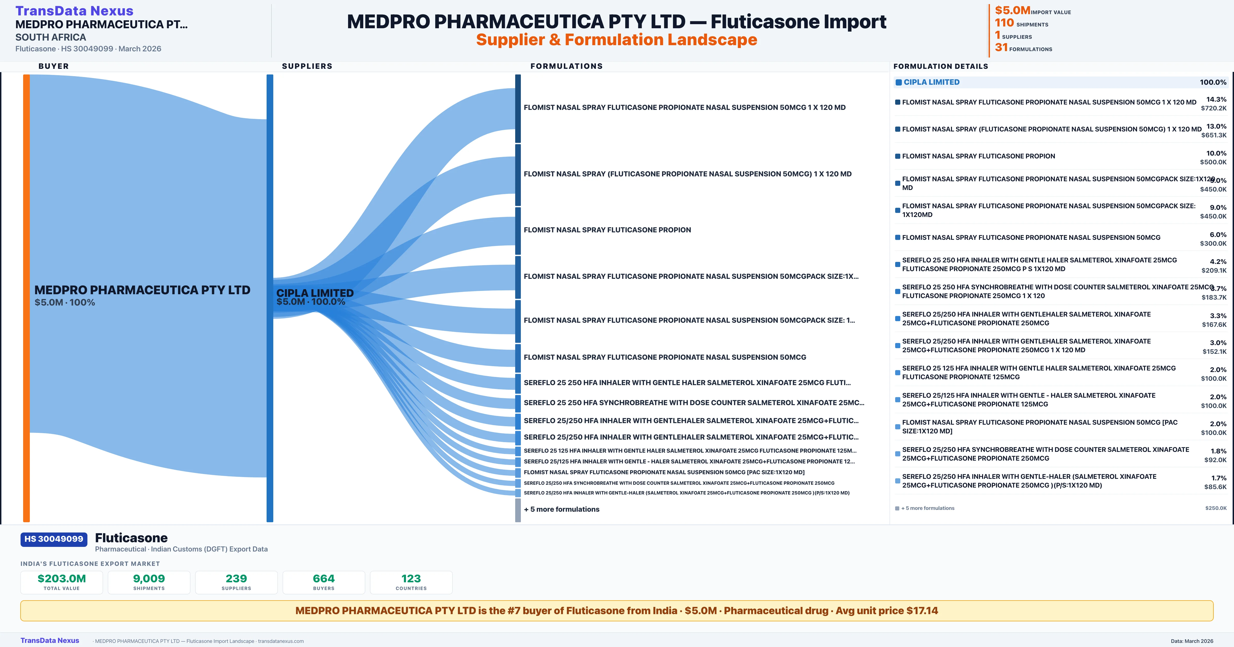 MEDPRO PHARMACEUTICA PTY LTD sources Fluticasone from 1 verified Indian supplier: CIPLA LIMITED ($5.0M, 100.0%). This is based on 110 customs records.