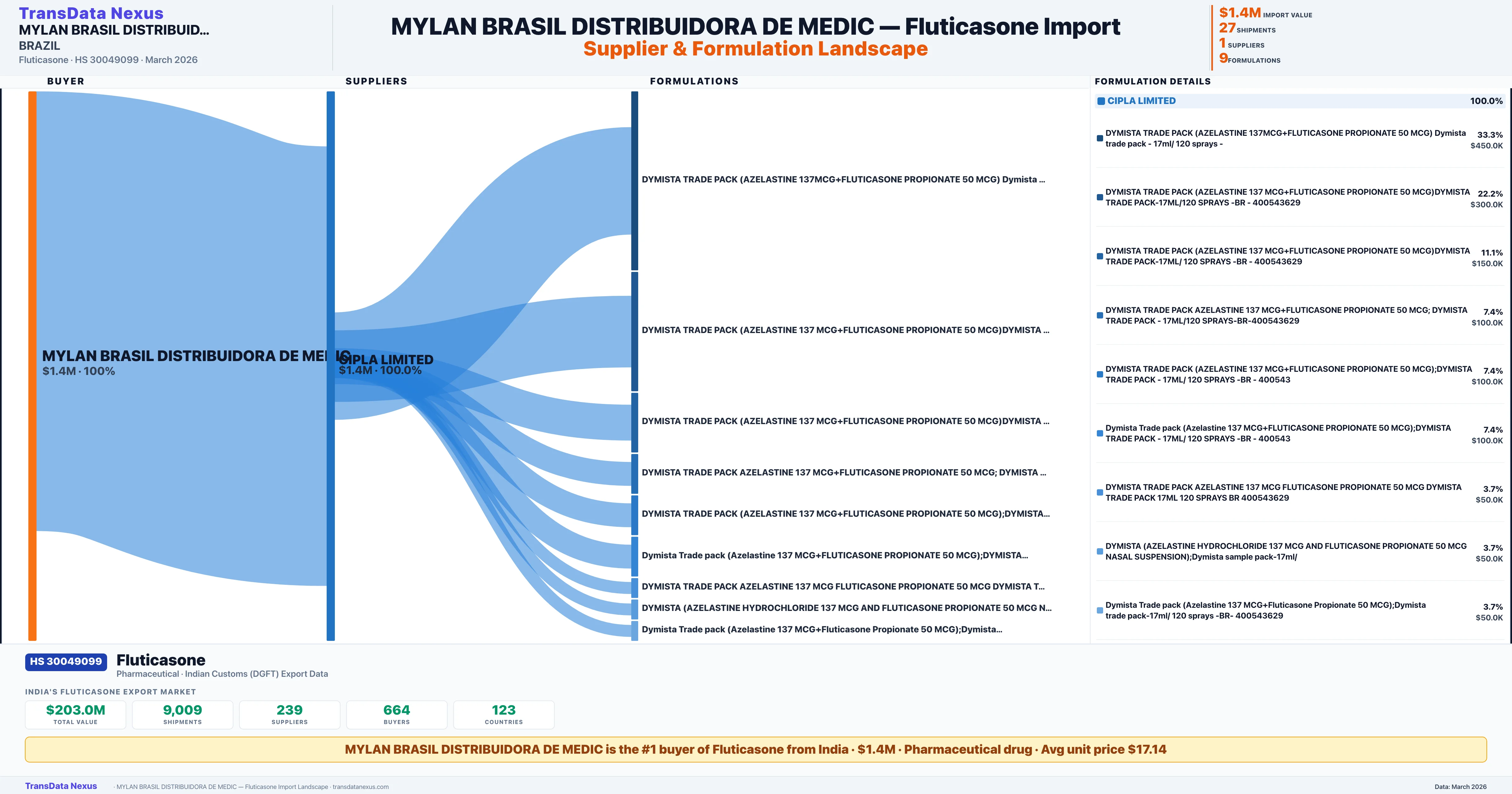 MYLAN BRASIL DISTRIBUIDORA DE MEDIC sources Fluticasone from 1 verified Indian supplier: CIPLA LIMITED ($1.4M, 100.0%). This is based on 27 customs records.