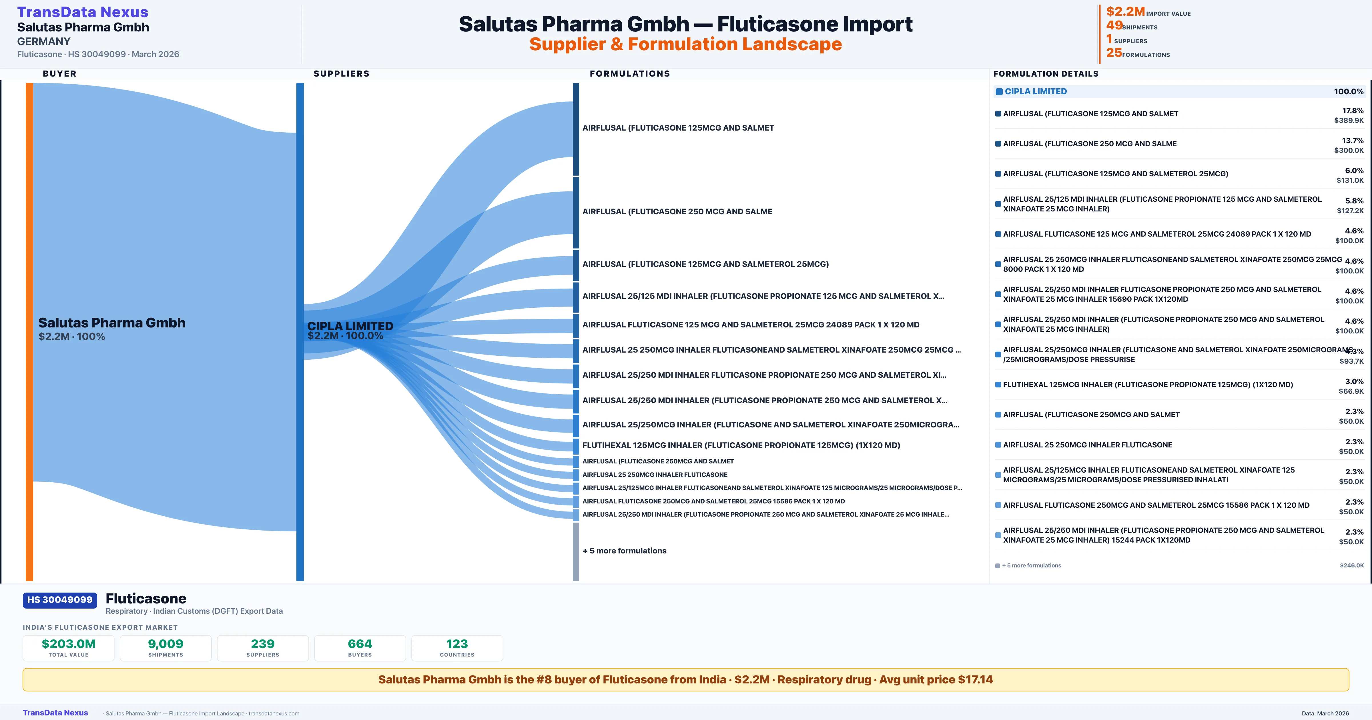 SALUTAS PHARMA GMBH sources Fluticasone from 1 verified Indian supplier: CIPLA LIMITED ($2.2M, 100.0%). This is based on 49 customs records.
