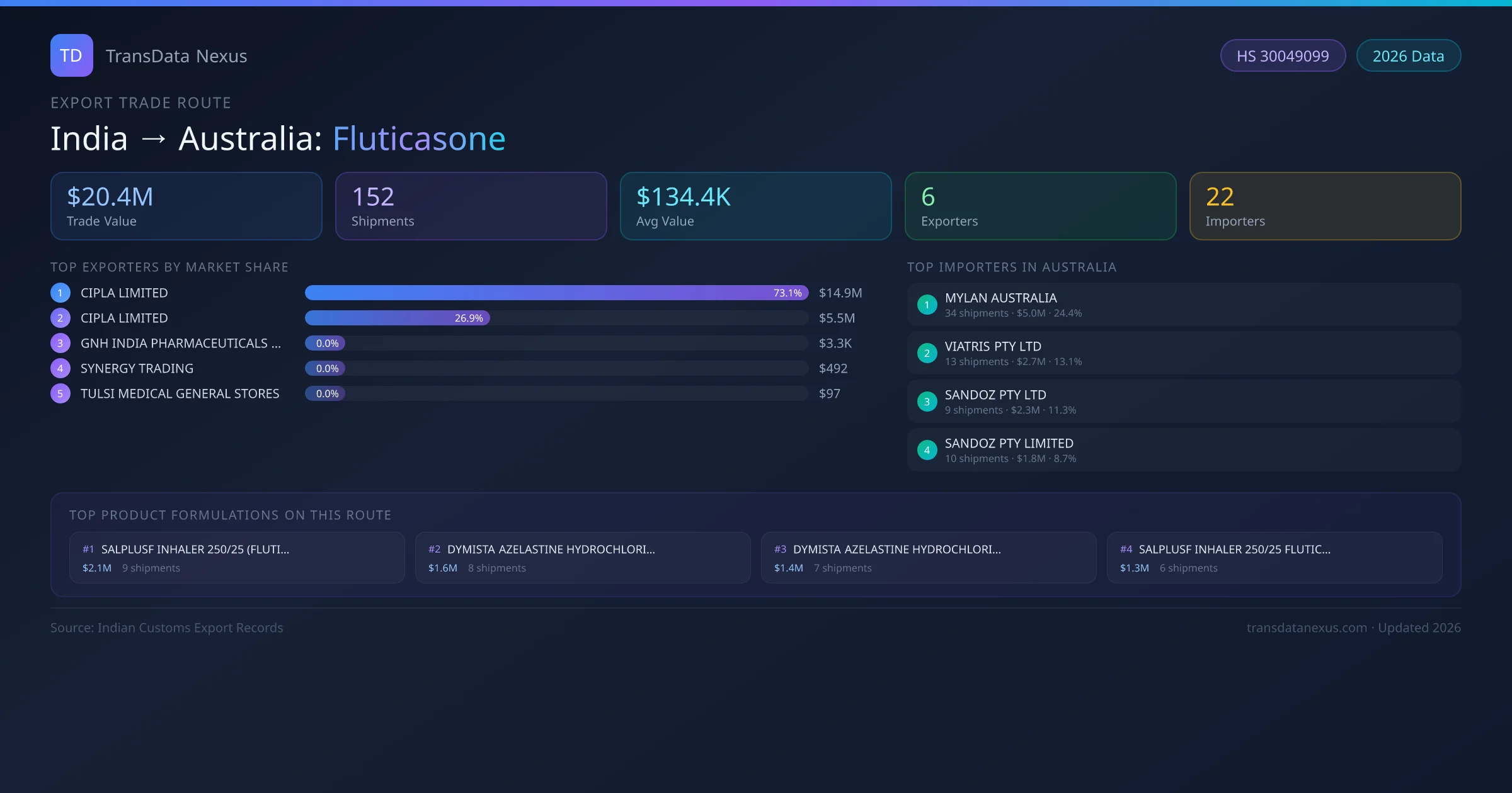 On the import side, key buyers of Indian fluticasone in Australia include MYLAN AUSTRALIA, VIATRIS PTY LTD, SANDOZ PTY LTD and 19 others. MYLAN AUSTRALIA is the single largest importer with 34 shipments valued at $5.0M USD.