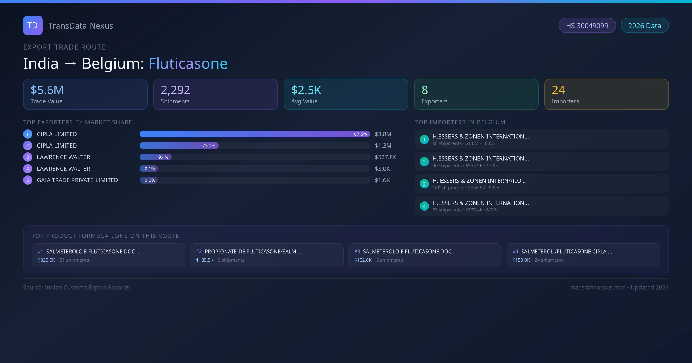 The India to Belgium Fluticasone corridor is one of India's established pharmaceutical export routes, with 2,292 shipments documented worth a combined $5.6M USD. The route is dominated by CIPLA LIMITED, which alone accounts for roughly 67% of all export value, reflecting the consolidated nature of India's fluticasone manufacturing sector.